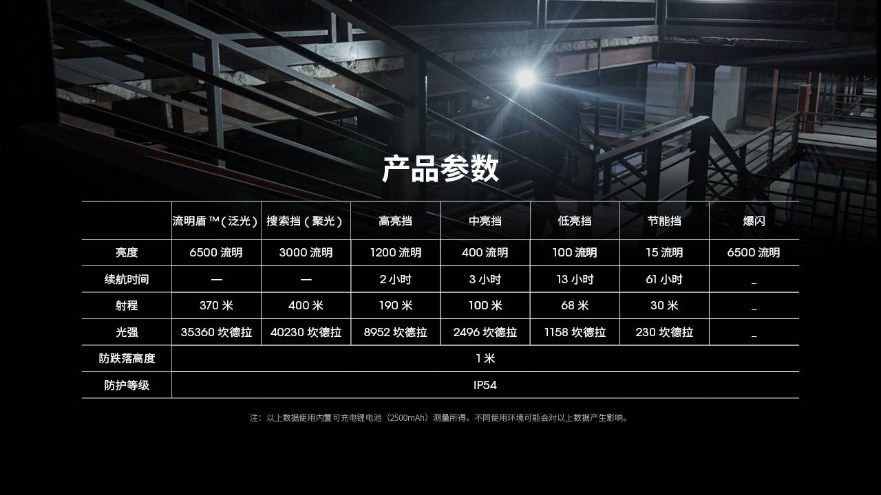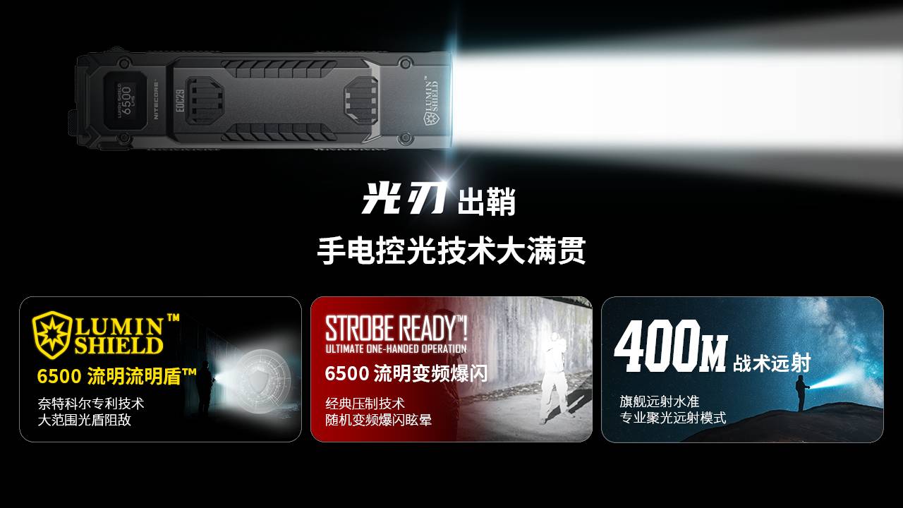 2. **高亮度输出**:最高亮度可达6500流明,提供400米的照射距离。