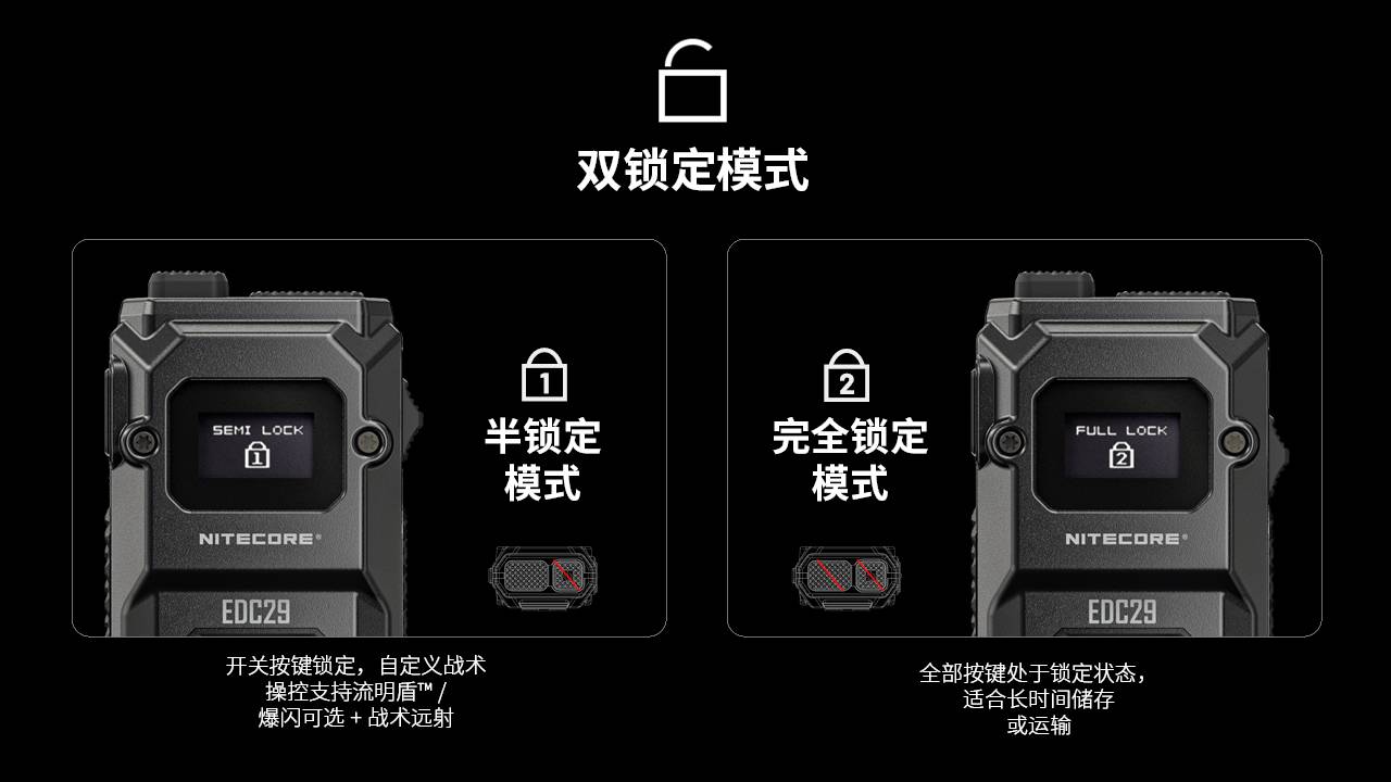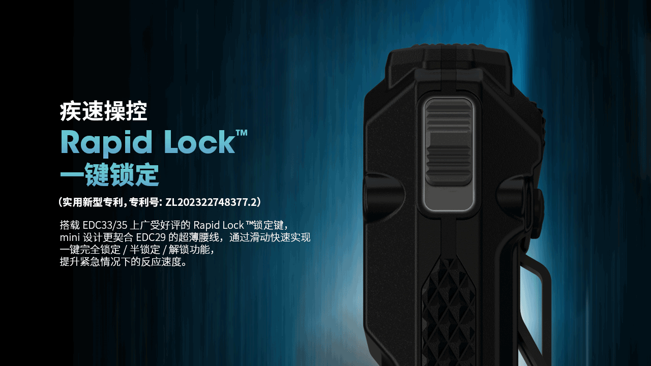 3. **Rapid Lock™锁定键**:EDC29搭载了Rapid Lock™锁定键,通过滑动快速实现一键完全锁定/半锁定/解锁功能,提升紧急情况下的反应速度。