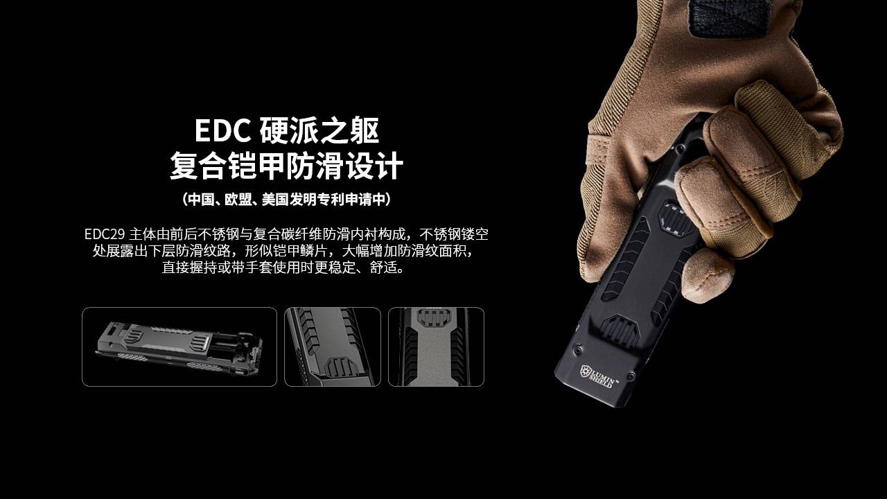 4. **复合铠甲防滑设计**:EDC29主体由前后不锈钢与复合碳纤维防滑内衬构成,形似铠甲鳞片,大幅增加防滑纹面积,提供稳定、舒适的握持感。