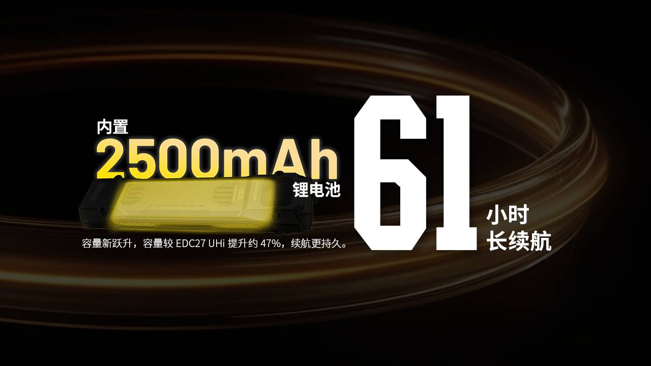 5. **长续航能力**:内置2500mAh锂电池,容量较EDC27 UHi提升约47%,续航更持久,可达61小时。