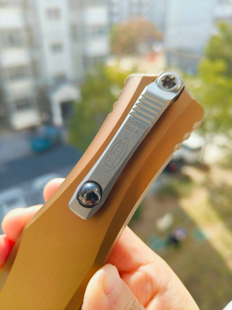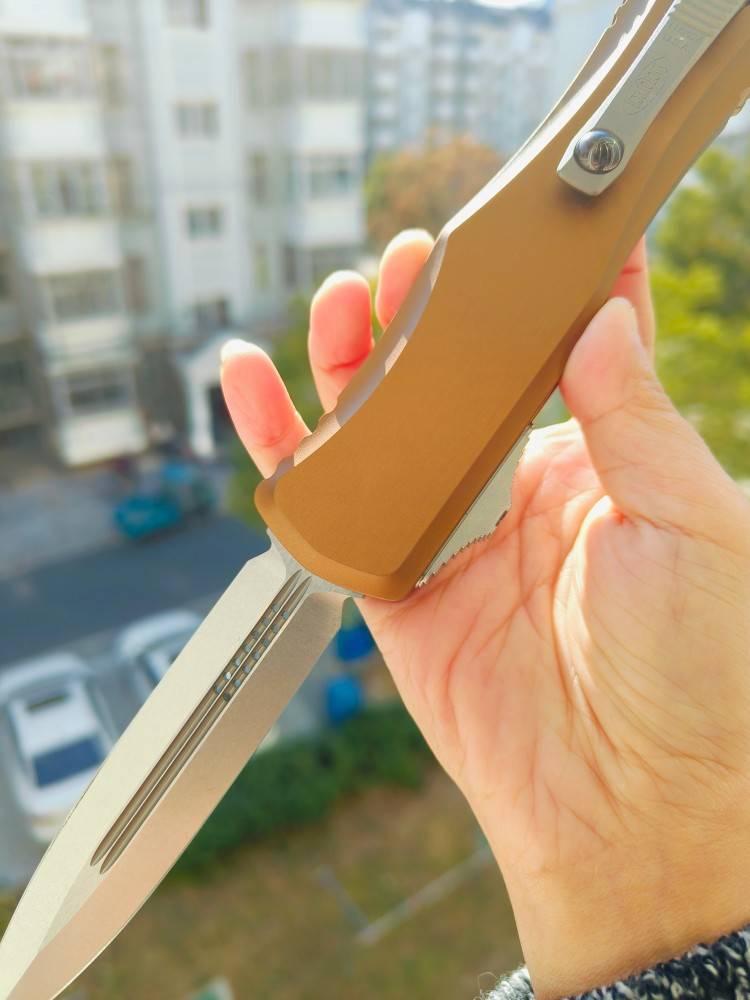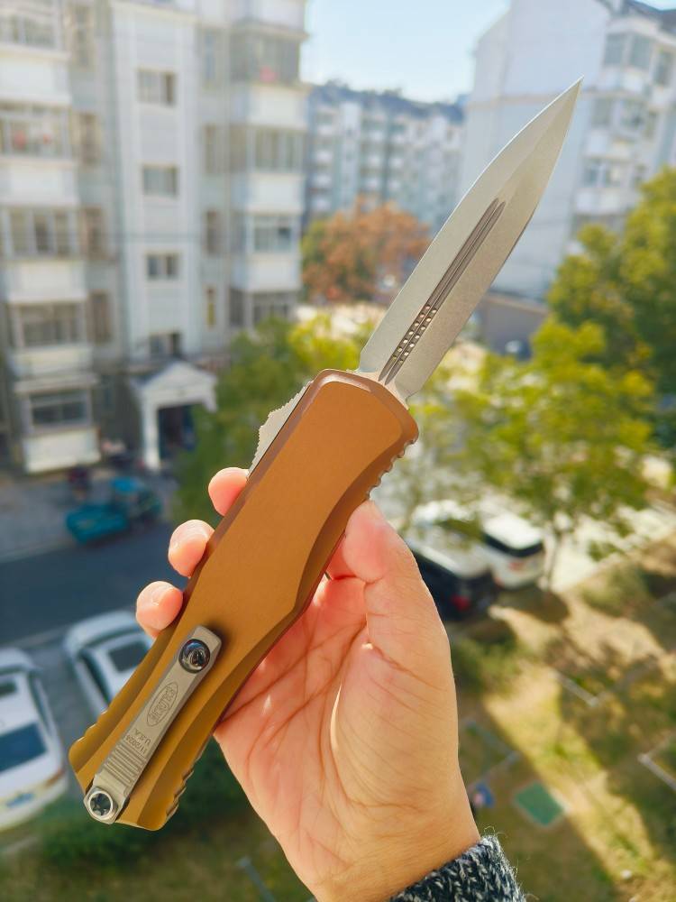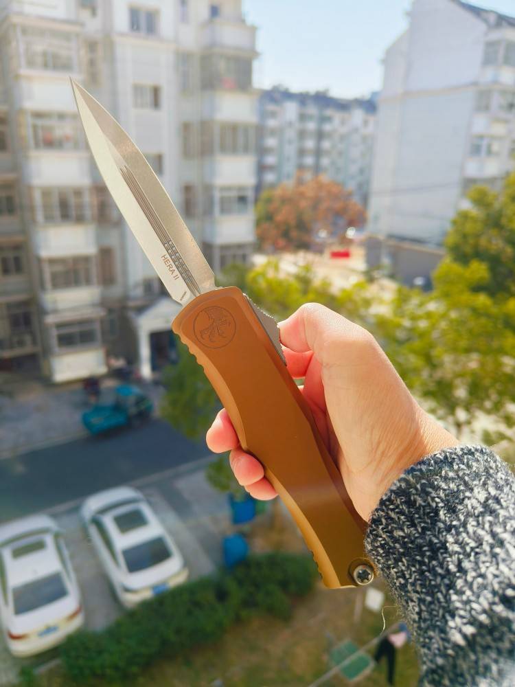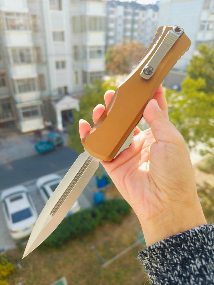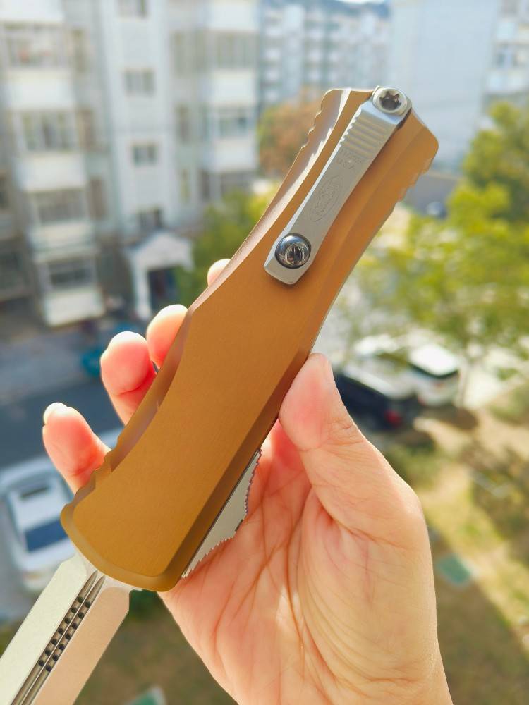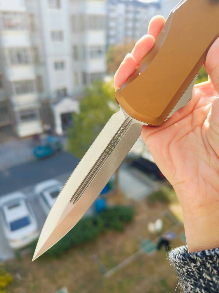 • 刀片长度:10.16 厘米(4.00 英寸),石洗处理的 D/E M390MK 刀片,刃口长度为 9.6875 厘米(3.8125 英寸)。 • 总长度:23.8125 厘米(9.375 英寸)。 • 重量:139 克(4.9 盎司)。 • 硬件采用石洗处理。 • 手柄为米色阳极氧化铝材质。 • 采用自动弹出机制。 • 设有挂绳孔。 • 尾部带有破窗器。 • 配备石洗钢材质的背夹,带有陶瓷滚珠