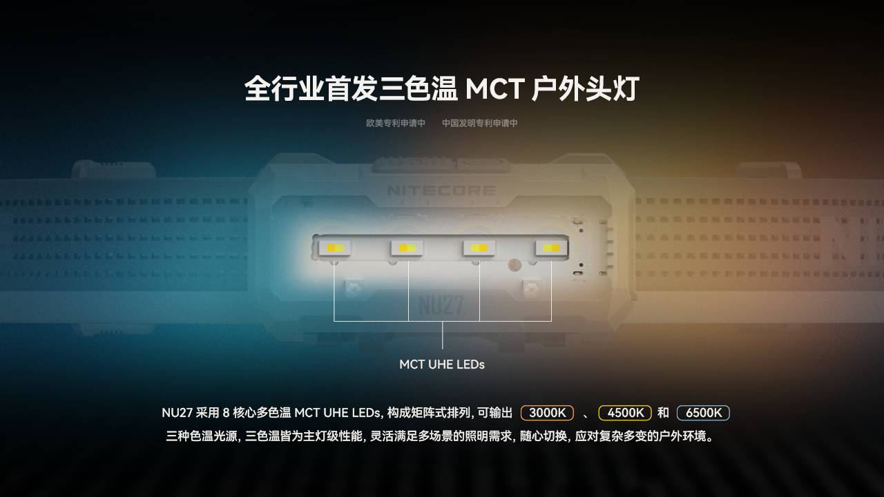 - 首发 MCT UHE LEDs,采用 8 核心多色温多通道 UHE LED,构成矩阵式排列,可输出 3000K(黄光)、4500K(中白光)和 6500K(冷白光)三种色温的照明,且三色温皆为主灯级性能,灵活满足多场景的照明需求,随心切换,以应对复杂多变的户外环境。3000K 暖黄光可有效减少光的散射,提高在雨雾、雪天等恶劣条件下的能见度;4500K 中白光如清晨自然光色,柔和清晰,适合全场景使用;6500K 冷白光可在长时间徒步 / 跑步疲劳时用于提神,激发斗志。
