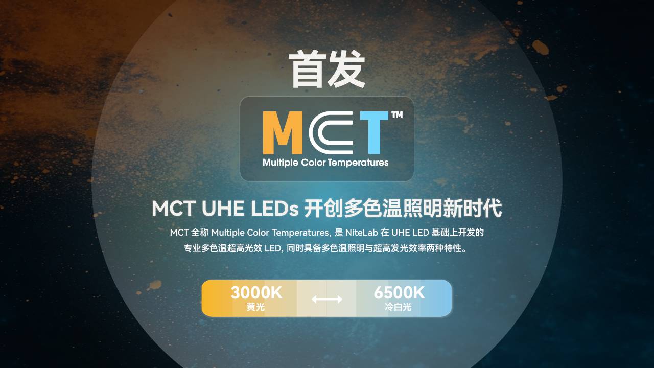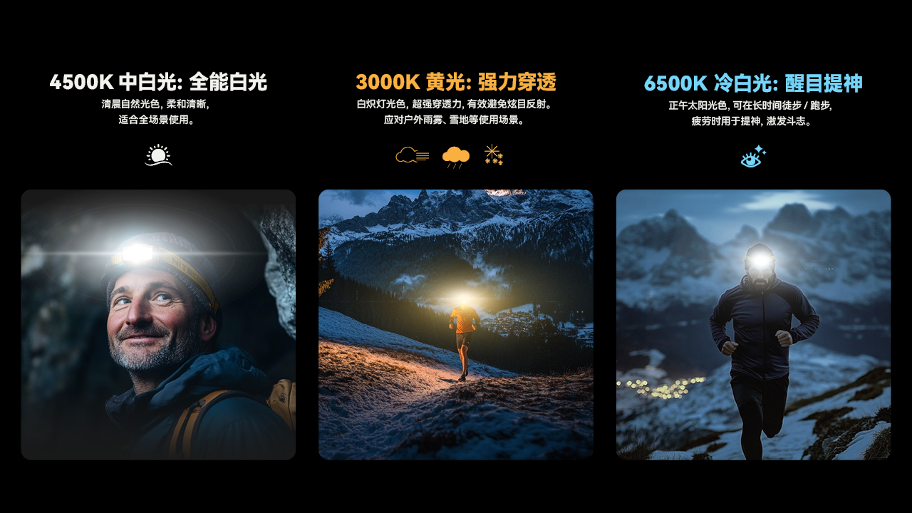 - 首发 MCT UHE LEDs,采用 8 核心多色温多通道 UHE LED,构成矩阵式排列,可输出 3000K(黄光)、4500K(中白光)和 6500K(冷白光)三种色温的照明,且三色温皆为主灯级性能,灵活满足多场景的照明需求,随心切换,以应对复杂多变的户外环境。3000K 暖黄光可有效减少光的散射,提高在雨雾、雪天等恶劣条件下的能见度;4500K 中白光如清晨自然光色,柔和清晰,适合全场景使用;6500K 冷白光可在长时间徒步 / 跑步疲劳时用于提神,激发斗志。