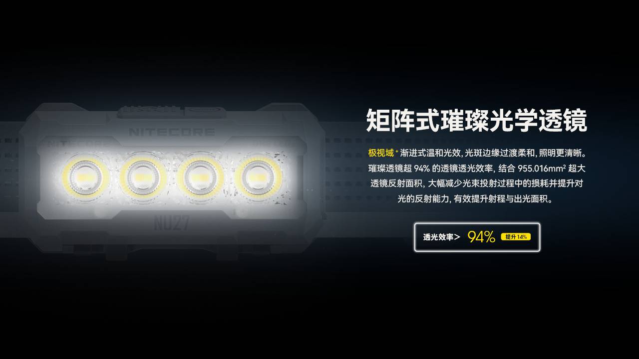 - 搭配矩阵式璀璨光学透镜,即极视域 * 渐进式温和光效,光斑边缘过渡柔和,照明更清晰。该透镜超 94% 的透光效率,结合 955.016mm² 超大透镜反射面积,大幅减少光束投射过程中的损耗并提升对光的反射能力,有效提升射程与出光面积,50.3mm 的发光宽度在照明时具有立体清晰宽广的效果。