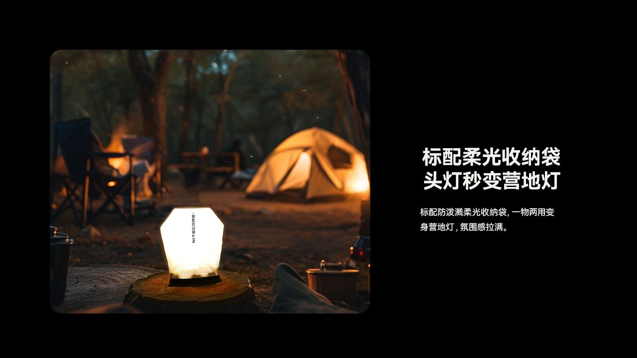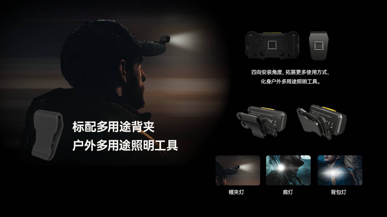 - 标配多用途的背夹,可当头灯、肩灯、背包灯等使用;配有充电线以及可做柔光罩的收纳袋,一物两用,使头灯秒变营地灯,氛围感拉满,小配件也可直接收纳携带,防止丢失。