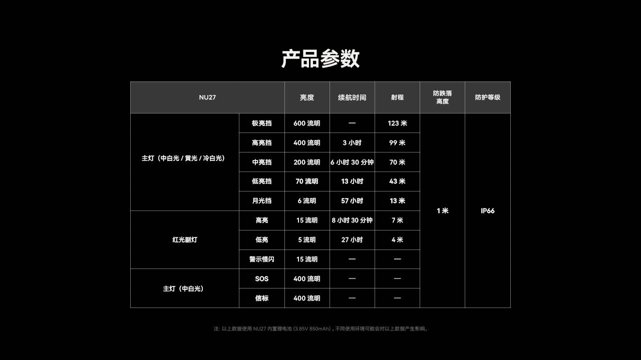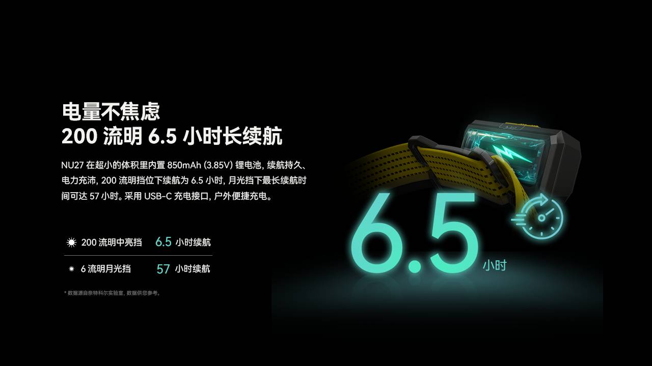 - 有多个亮度档位,在 200 流明的亮度时可实现 6.5 小时的续航周期。