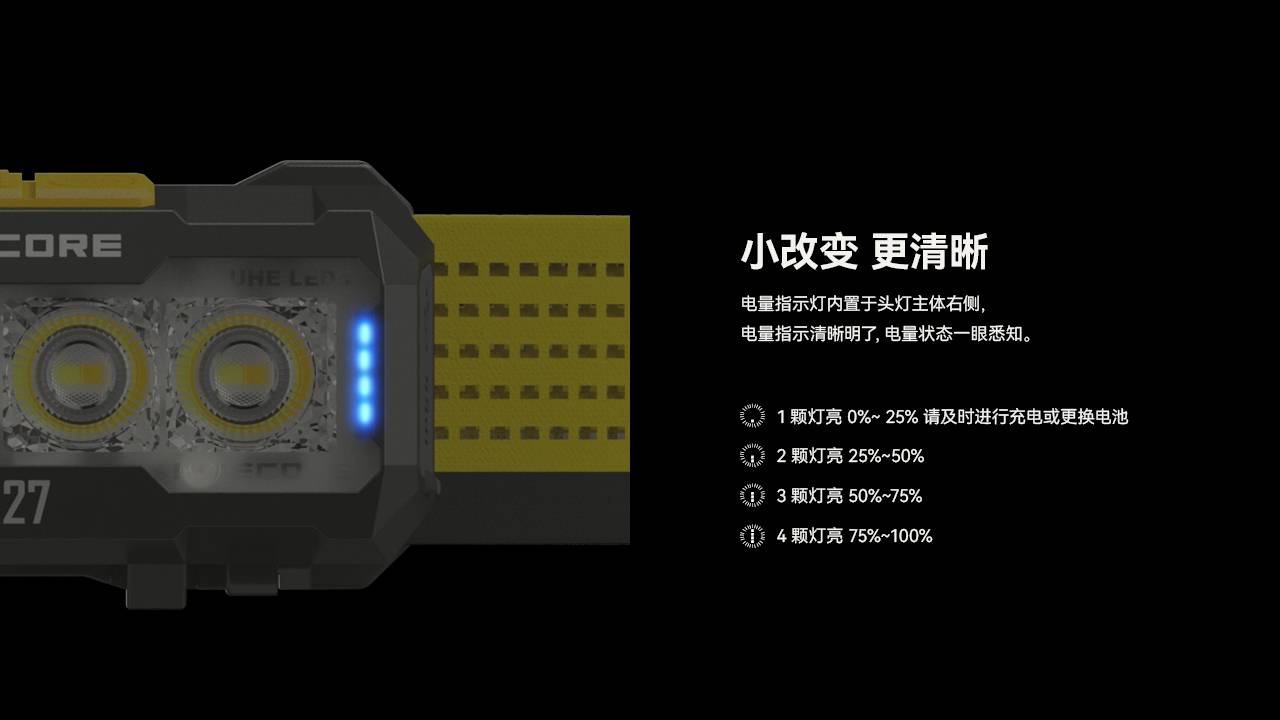 - 电量指示灯设置在头灯的一侧,4 颗灯亮分别对应不同的电量状态,白天也能清晰显示。1 颗灯亮表示电量为 0% 至 25%,需及时充电或更换电池;2 颗灯亮表示电量为 25% 至 50%;3 颗灯亮表示电量为 50% 至 75%;4 颗灯亮表示电量为 75% 至 100%。