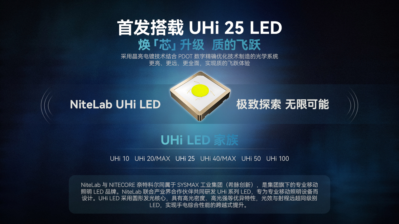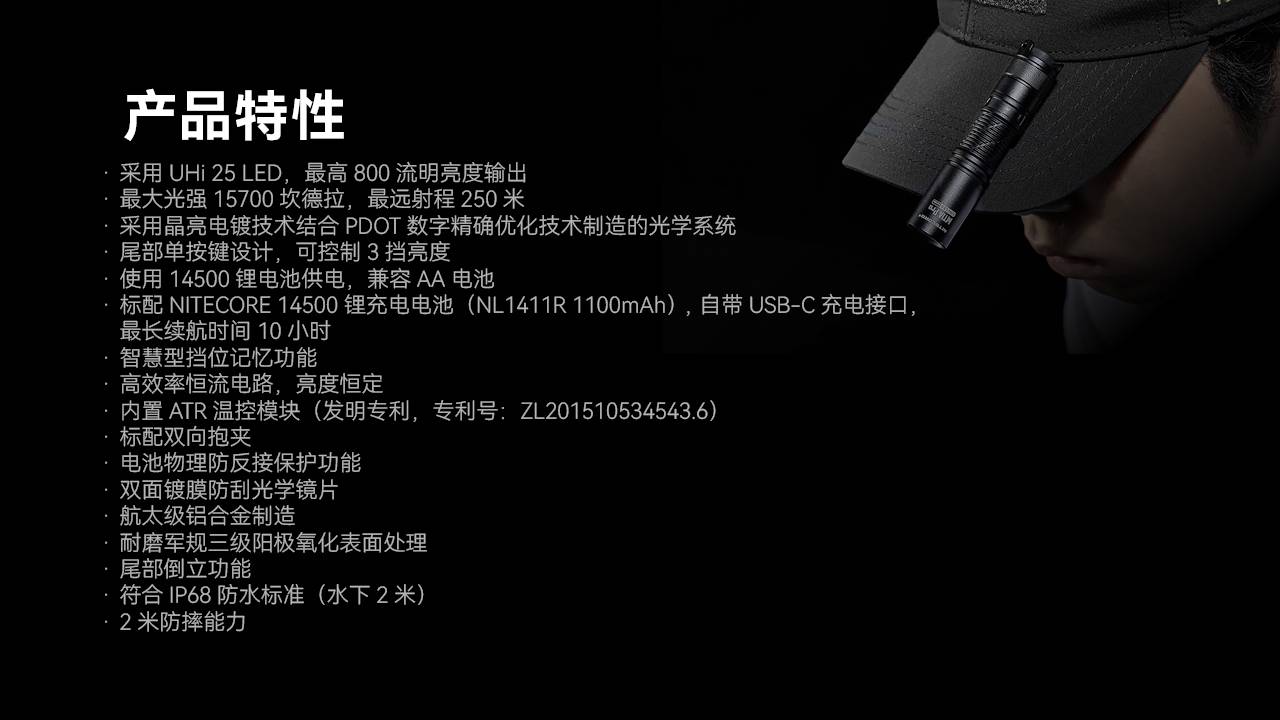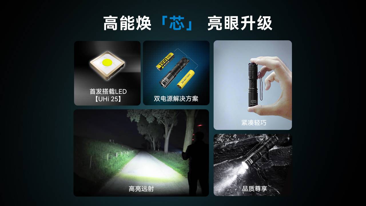 - 高亮度输出:首发搭载 NiteLab UHi 25 LED,最高可输出 800 流明的强光,能够在黑暗环境中提供清晰、明亮的照明,最大射程可达 250 米(273 码),峰值光强为 15700 坎德拉,具有出色的远射能力,无论是户外探险、夜间巡逻还是日常使用,都能满足对亮度和射程的需求。