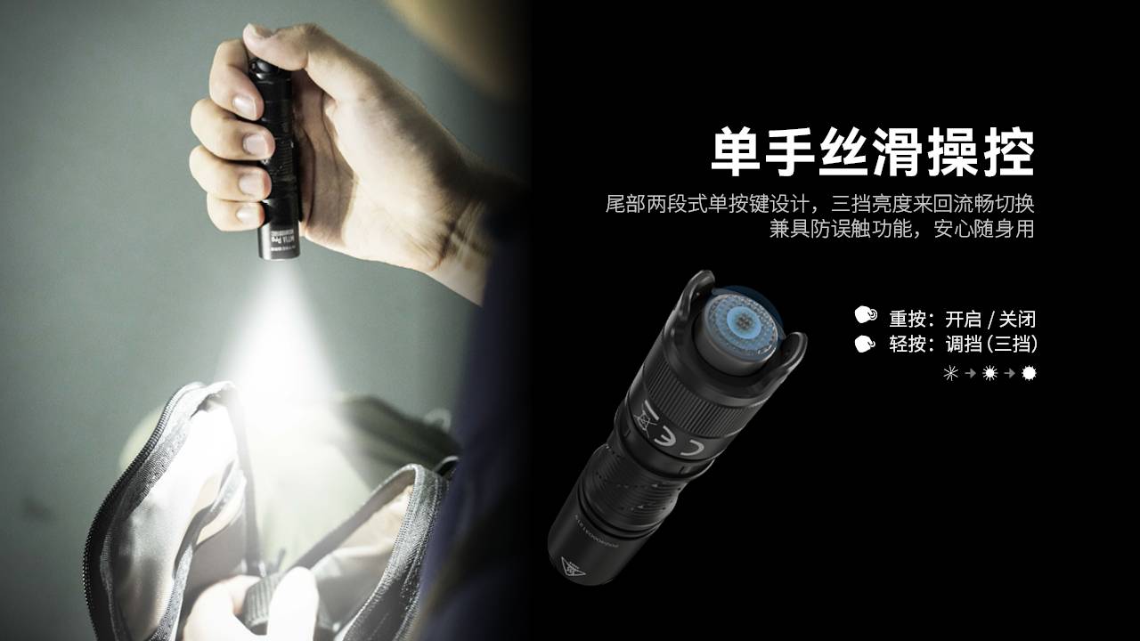 - 操作方便:采用单尾开关设计,操作简单,便于单手操作。通过尾部开关的全按和半按,可以轻松切换不同的亮度模式。