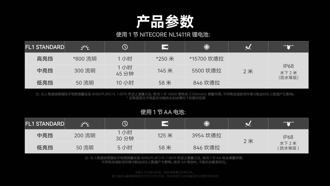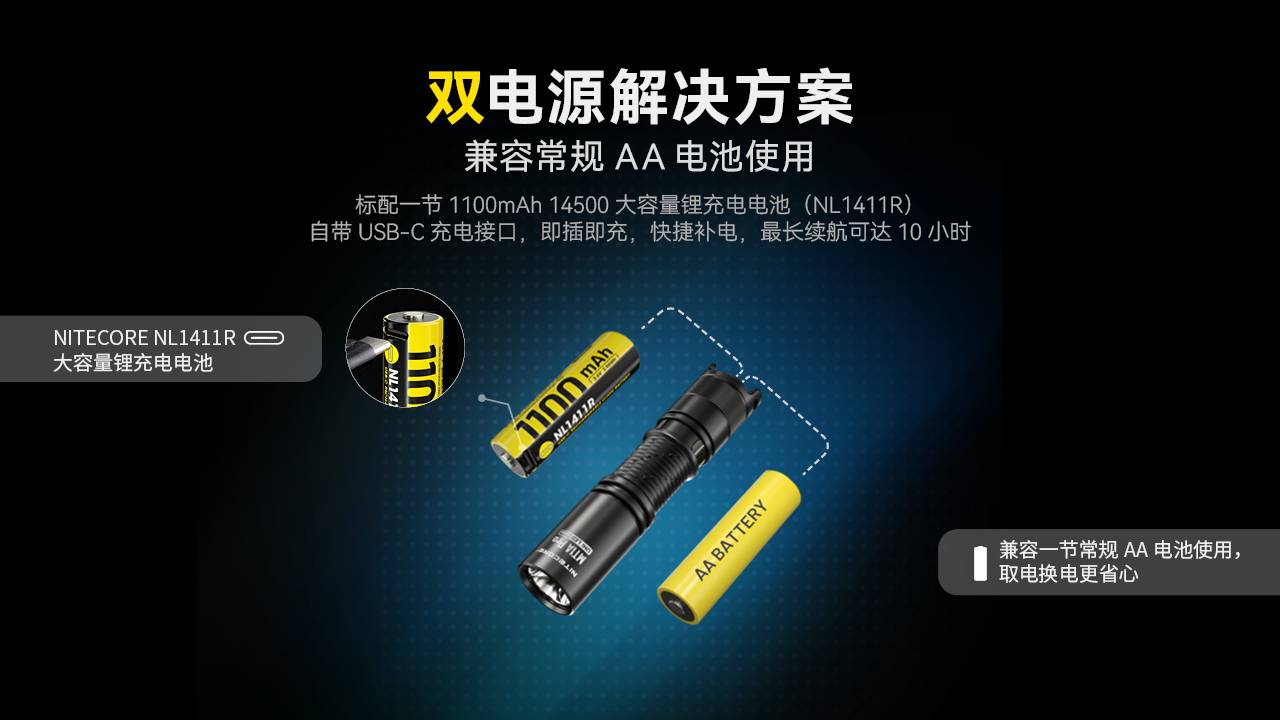 - 电池配置:标配一节 NL1411R 1100mAh 大容量 USB-C 锂充电电池,也可兼容常规 AA 电池使用。在使用 NL1411R 电池时,不同亮度模式下续航时间不同,高亮度 800 流明模式下可续航 1 小时,中亮度 300 流明模式下可续航 1 小时 45 分钟,低亮度 50 流明模式下可续航 10 小时;使用 AA 电池时,中亮度 200 流明模式下可续航 1 小时 30 分钟,低亮度 50 流明模式下可续航 5 小时。
