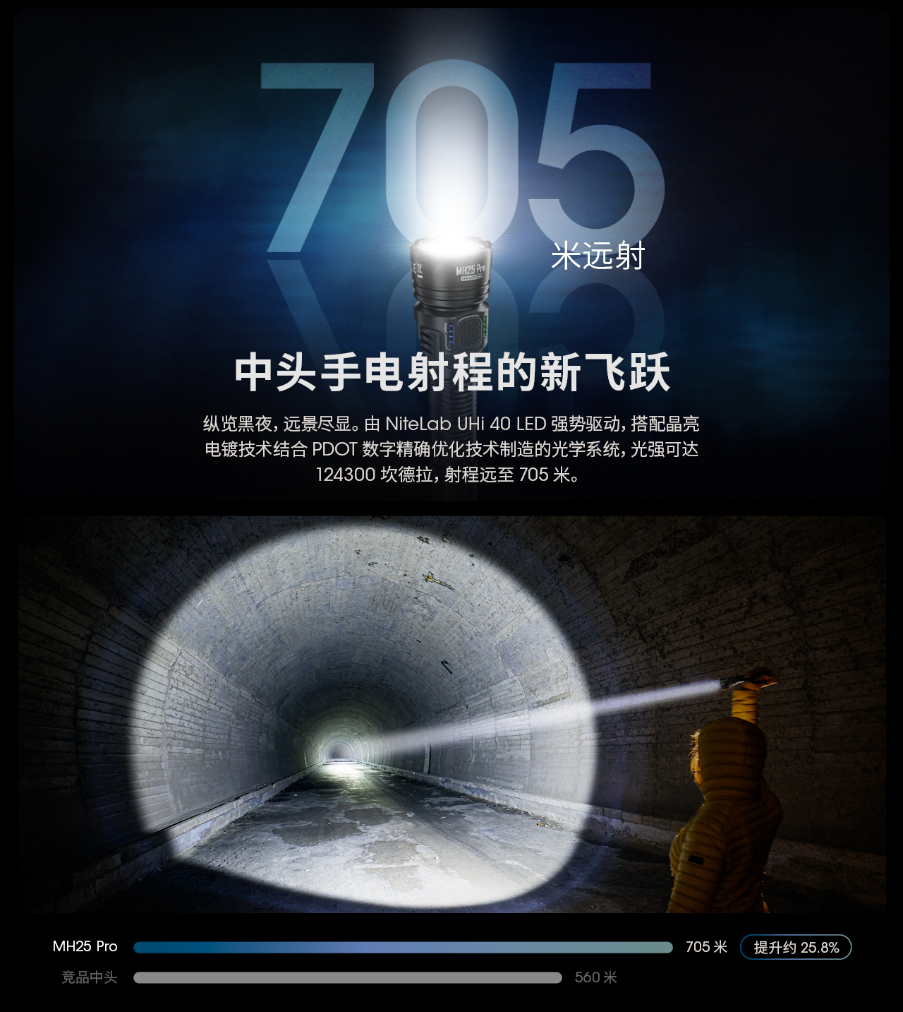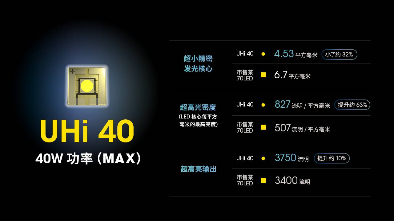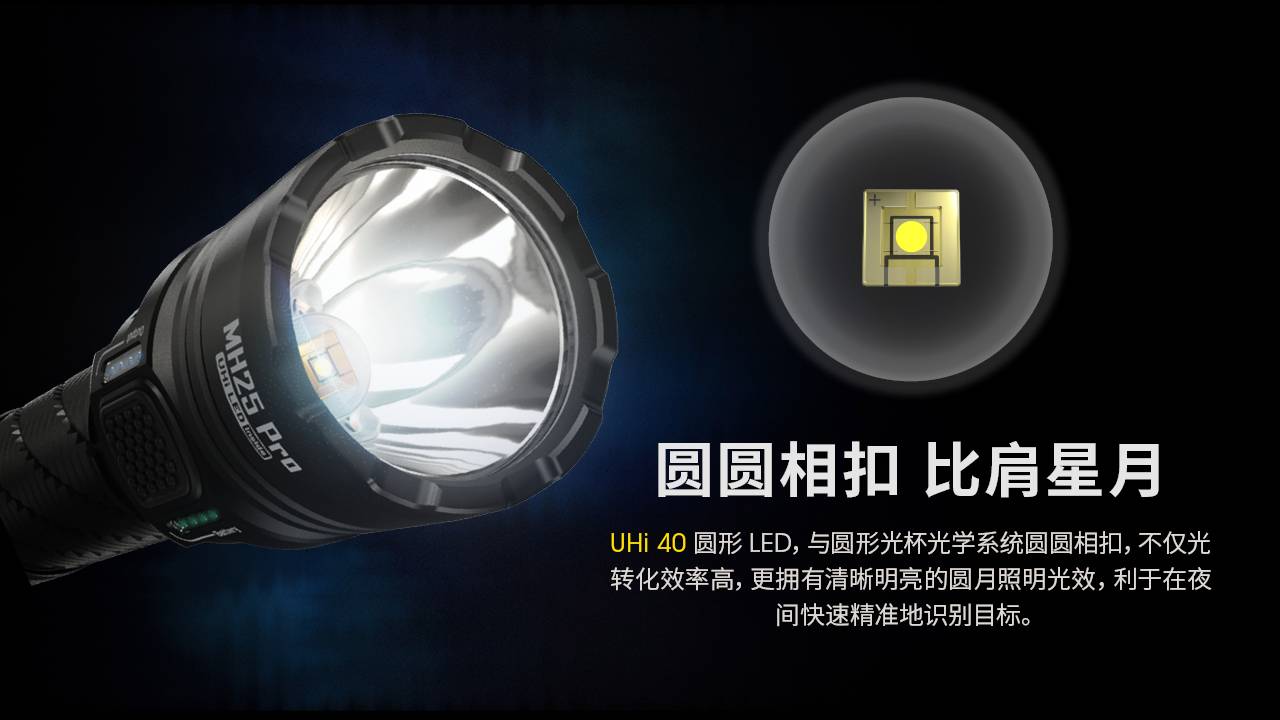 - 光学系统出色:采用晶亮电镀技术结合 PDOT 数字精确优化技术制造的光学系统,搭配圆形的 UHI 40 LED 灯珠,光转化效率高,不仅拥有清晰明亮的圆月照明光效,还有利于在夜间快速精准地识别目标。
