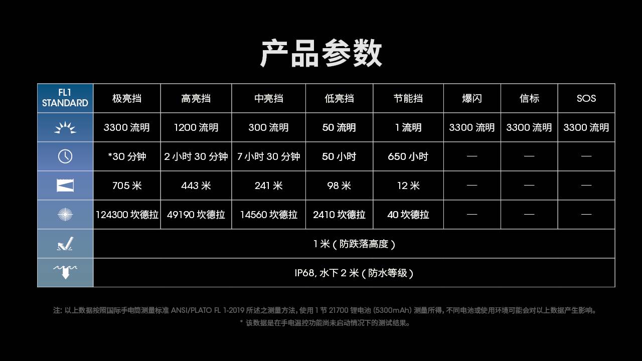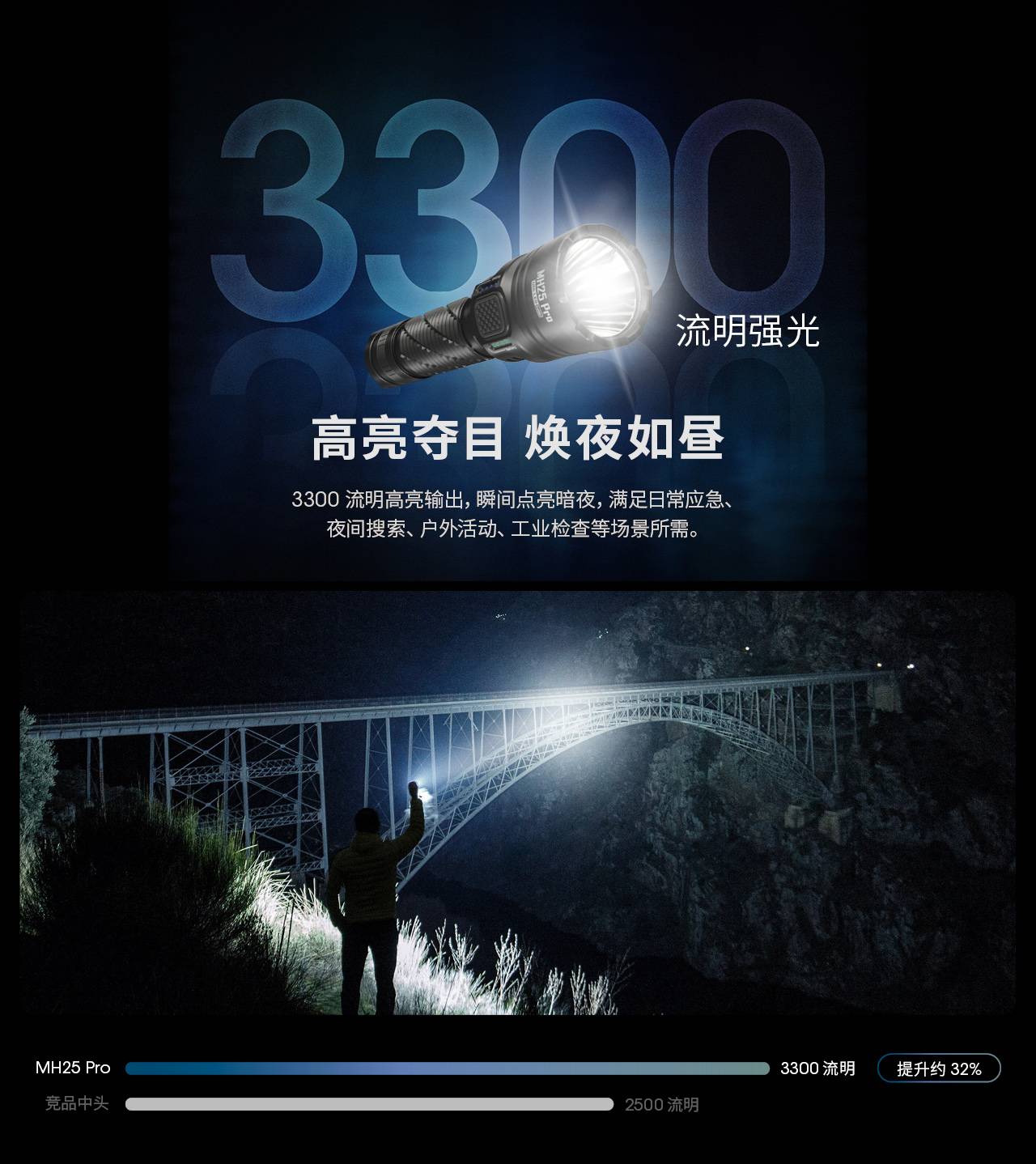 - 高亮度输出:最大亮度可达 3300 流明,如此高的亮度能够瞬间点亮暗夜,满足日常应急、夜间搜索、户外活动、工业检查等场景的照明需求。