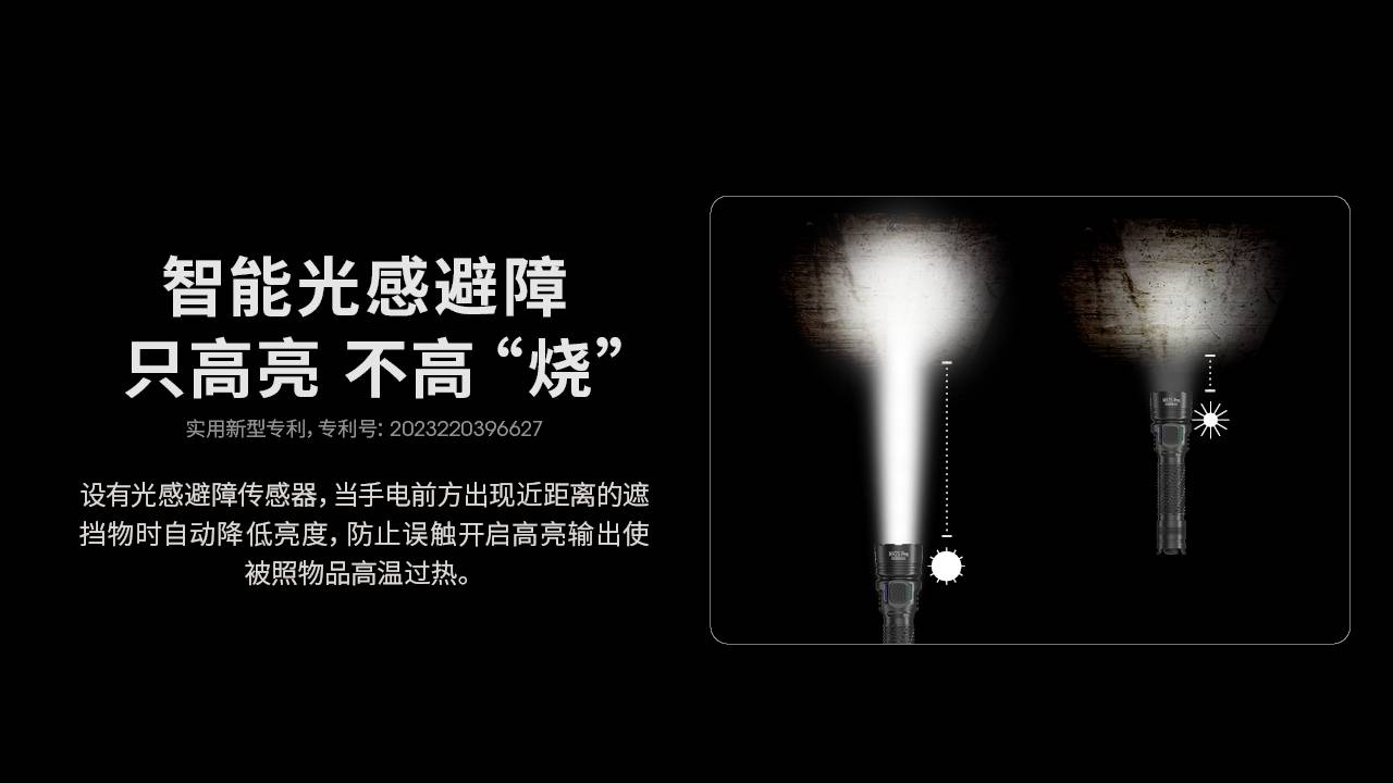 - 当手电前方出现近距离的遮挡物时,会自动降低亮度,防止误触开启高亮输出使被照物品高温过热,既保护了被照物体,也提高了使用的安全性。
