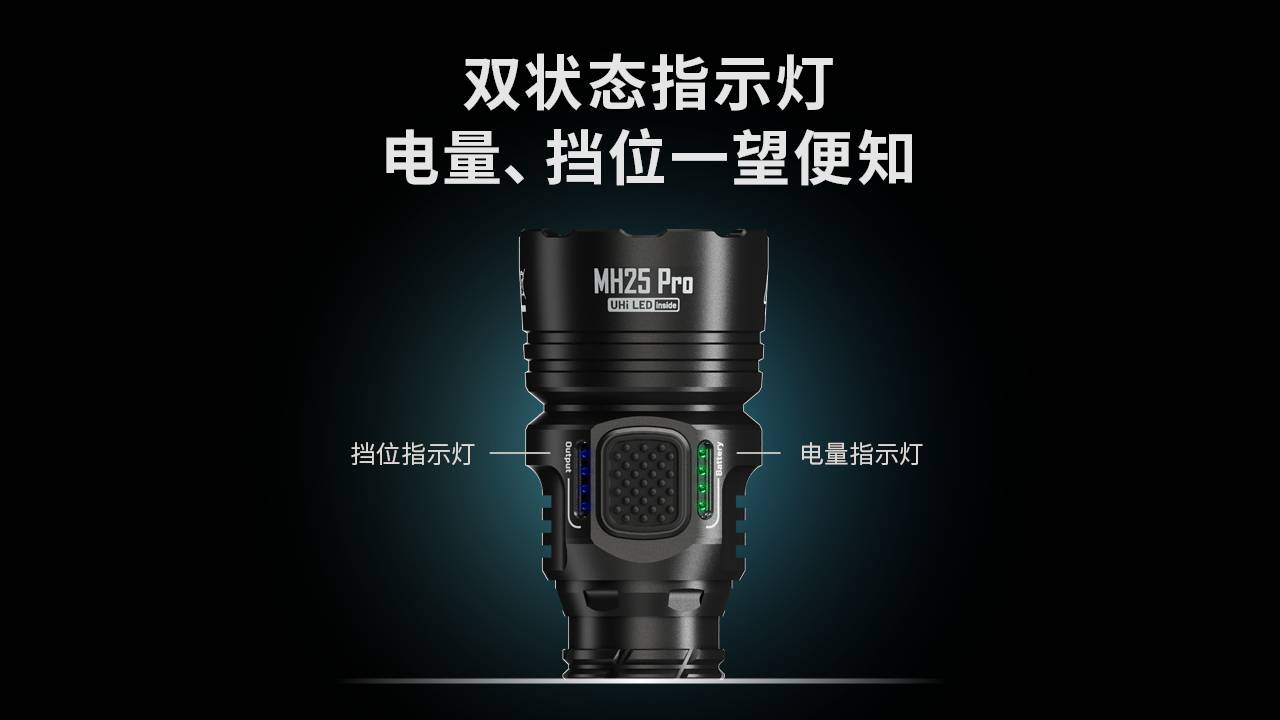 - 双状态指示灯:筒身前端分别设有 4 颗档位指示灯与电量指示灯,能够让用户在瞬间了解手电的状态,包括当前的亮度档位和剩余电量。