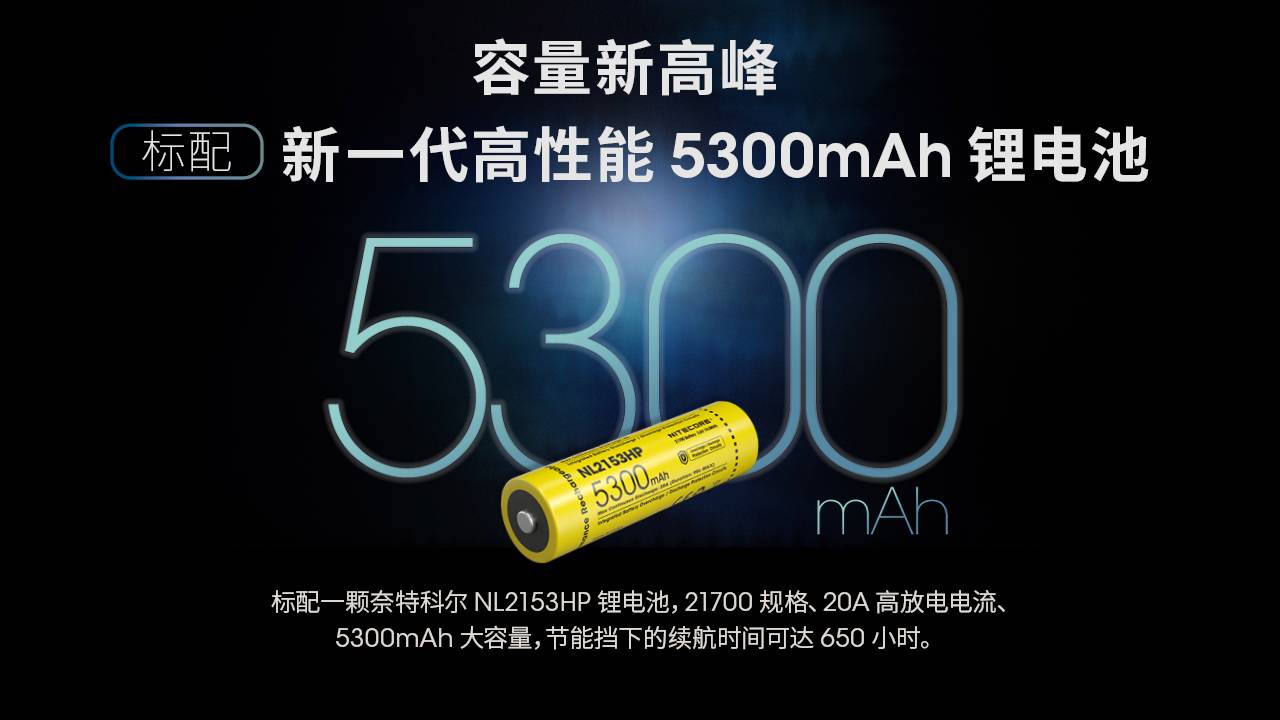 - 内置 5300mAh 的高性能 21700 锂电池,续航能力强劲,在节能档下的续航时间可达 650 小时。