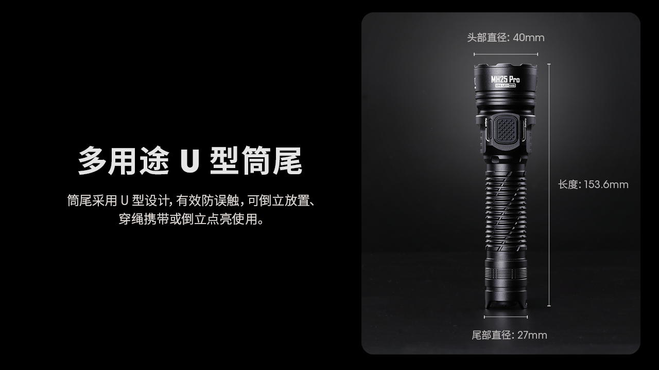 - U 型筒尾设计,可有效防误触,能倒立放置、穿绳携带或倒立点亮使用,解锁了不同的使用场景。