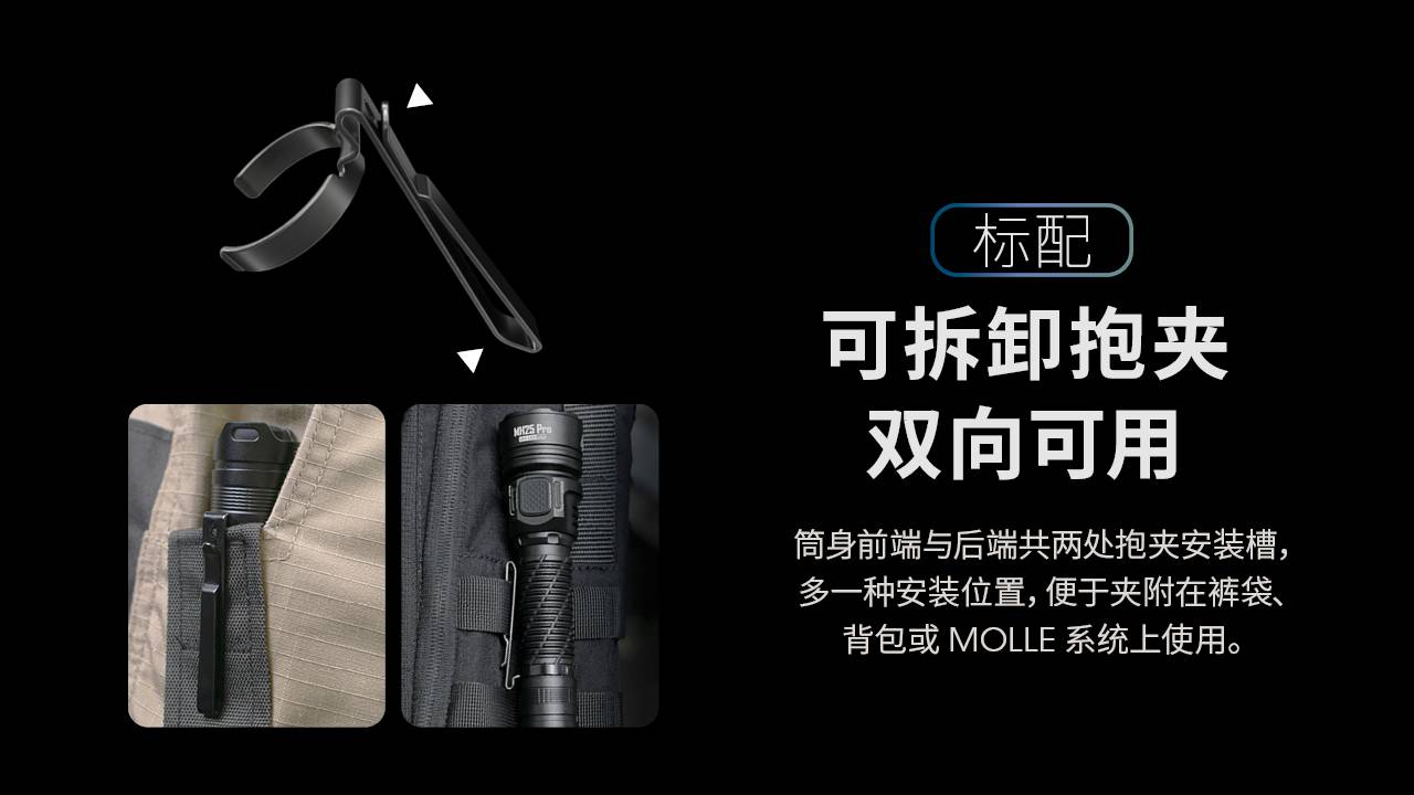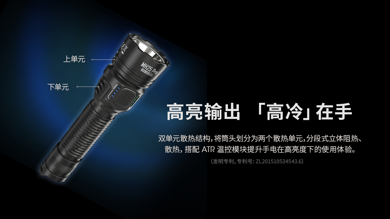 - 优秀的散热设计:采用双单元散热结构,将筒头划分为两个散热单元,分段式立体阻热、散热,搭配 ATR 温控模块,提升了手电在高亮度下的使用体验,避免了因过热而影响性能或缩短使用寿命。
