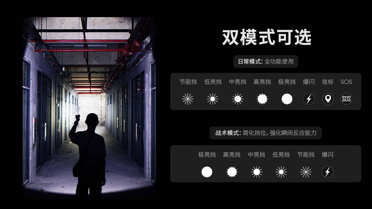 - 日常模式:具有 5 个亮度档位,包括节能档 1 流明、低亮 50 流明、中亮 300 流明、高亮 1200 流明、极亮 3300 流明,另外还有爆闪、信标、SOS 模式,以应对不同的使用场景。