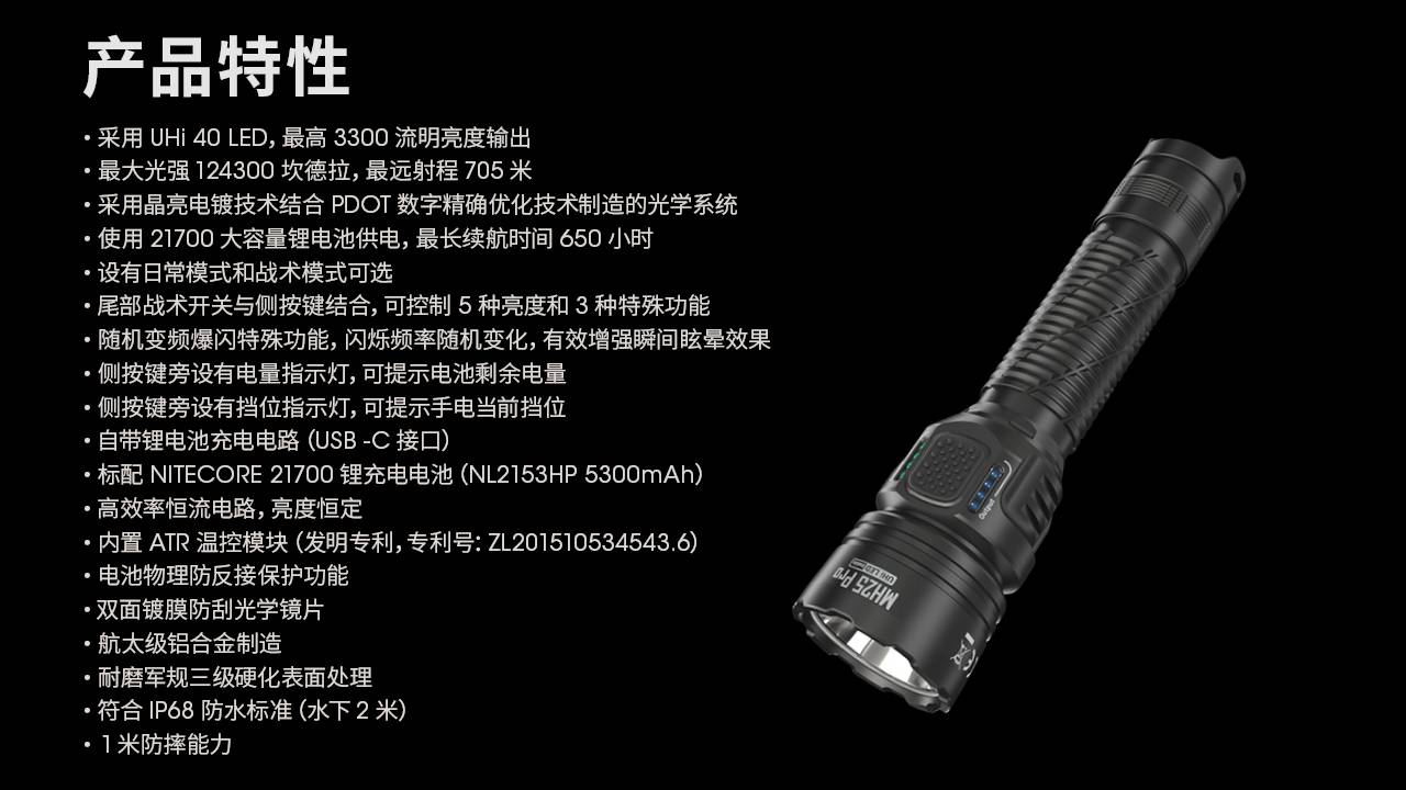- 远射能力强:最远射程为 705 米(约 771 码),光强可达 124300 坎德拉,相比其他中头手电具有明显优势,在远距离照明方面表现出色。