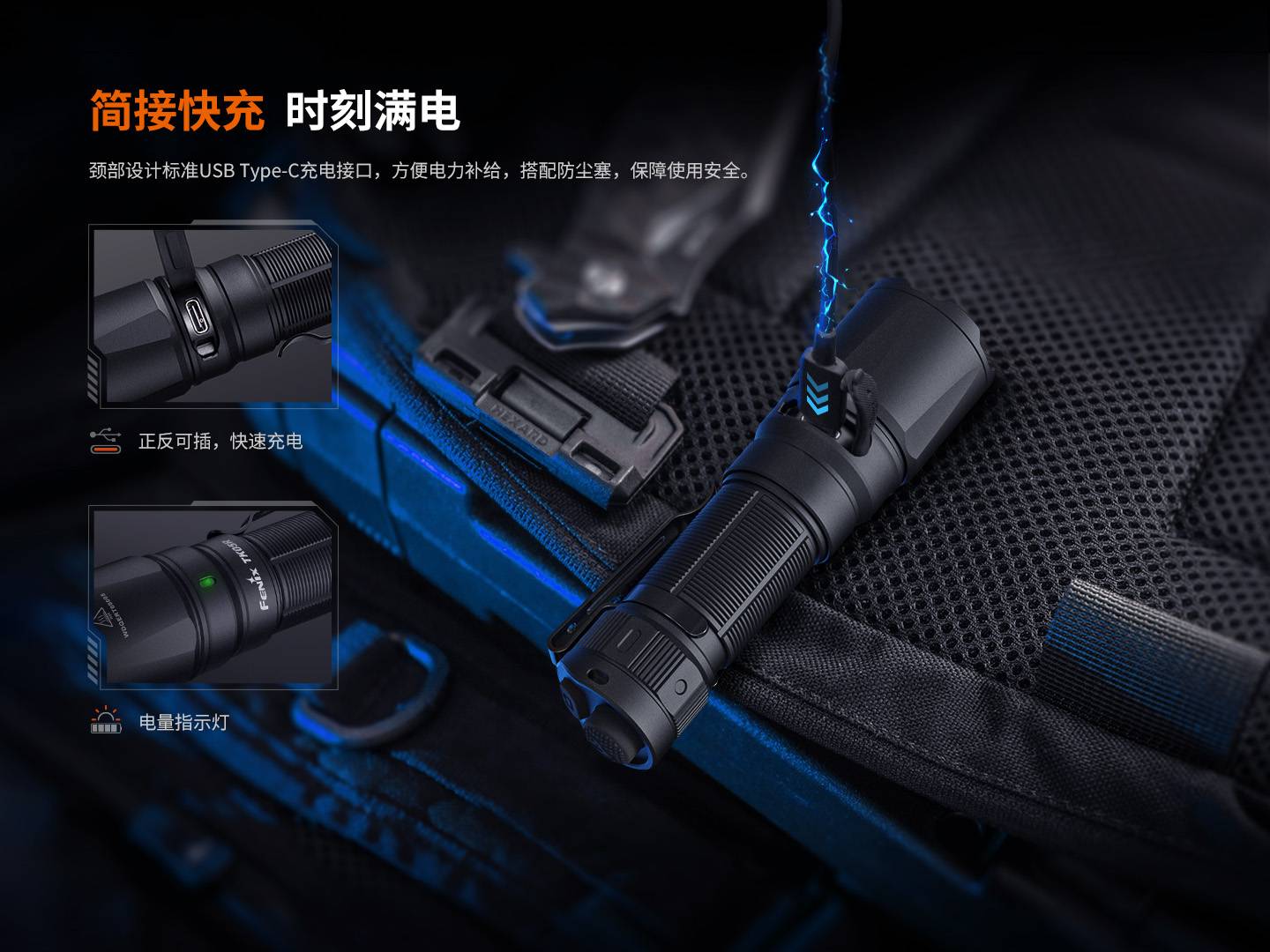 - 机身带USB Type-C充电接口,内防水结构