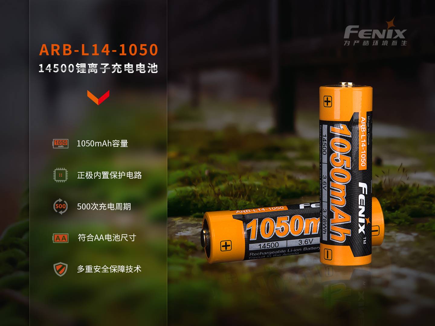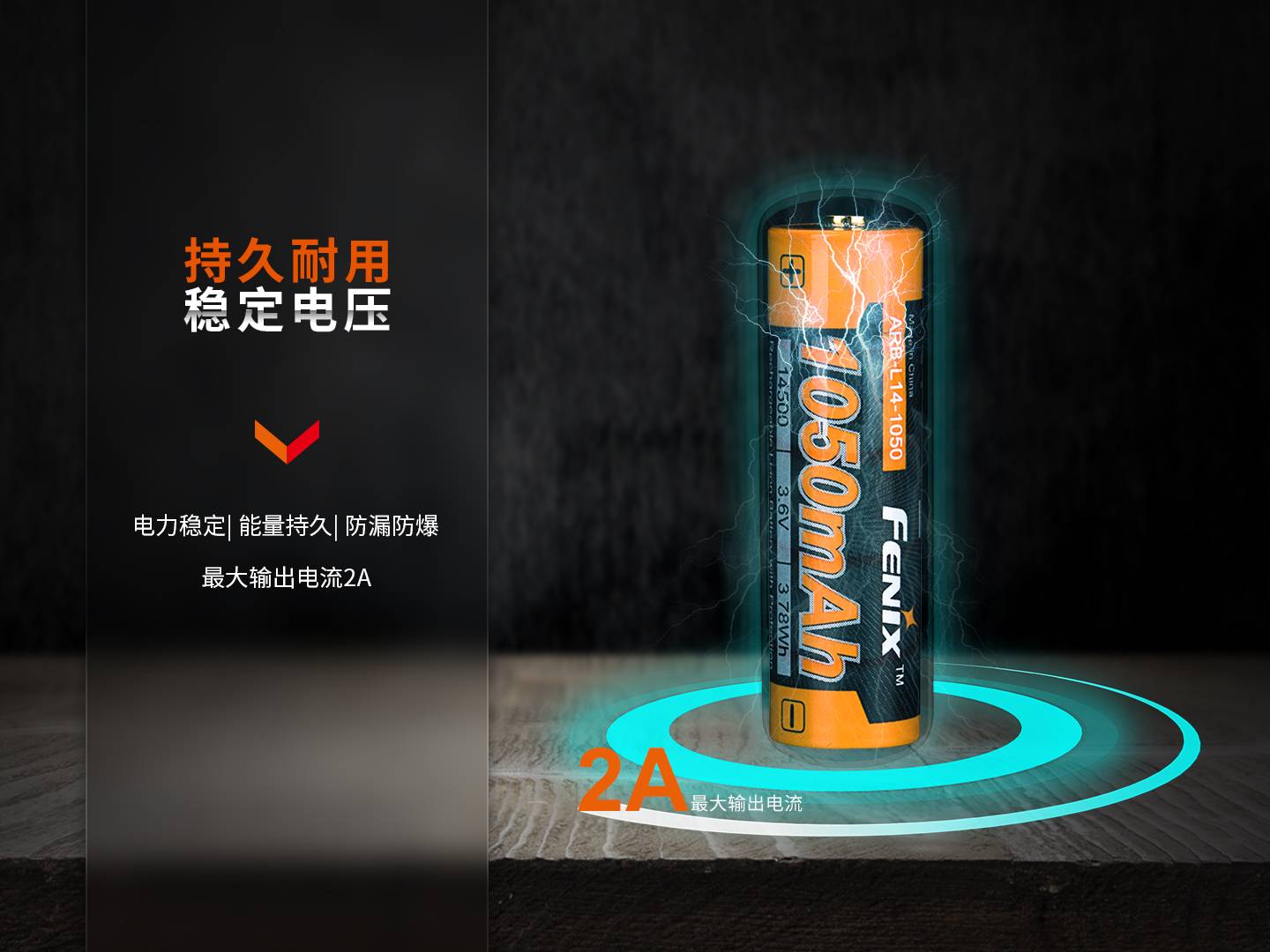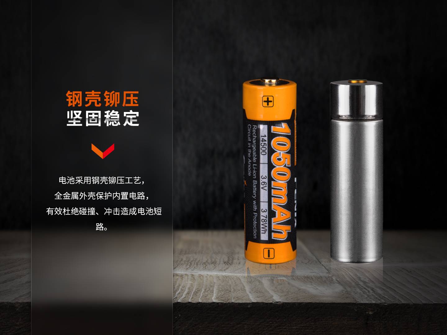 ARB-L14-1050是Fenix最新推出的14500充电锂离子电池,动力强劲,性能稳定,拥有1050mAh容量。多重安全保障,延长电池寿命,使用更放心;钢壳铆压工艺,给电池提供强硬保护;安全气孔设计,迅速排出内部废气。