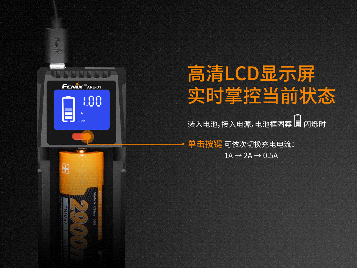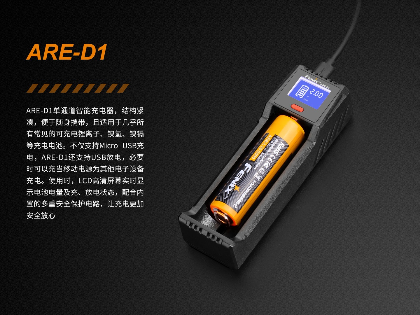ARE-D1单通道智能充电器结构紧凑,便于随身携带,且适用于几乎所有常见的可充电锂离子、镍氢、镍镉等充电电池。不仅支持Micro USB充电,ARE-D1还支持USB放电,必要时可以充当移动电源为其他电子设备充电。使用时,LCD高清屏幕实时显示电池电量及充、放电状态,配合内置的多重安全保护电路,让充电更加安全放心。