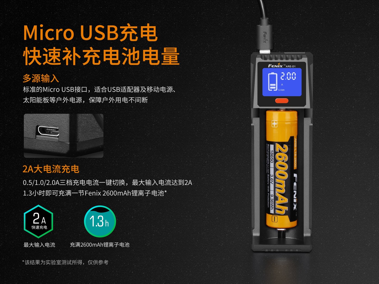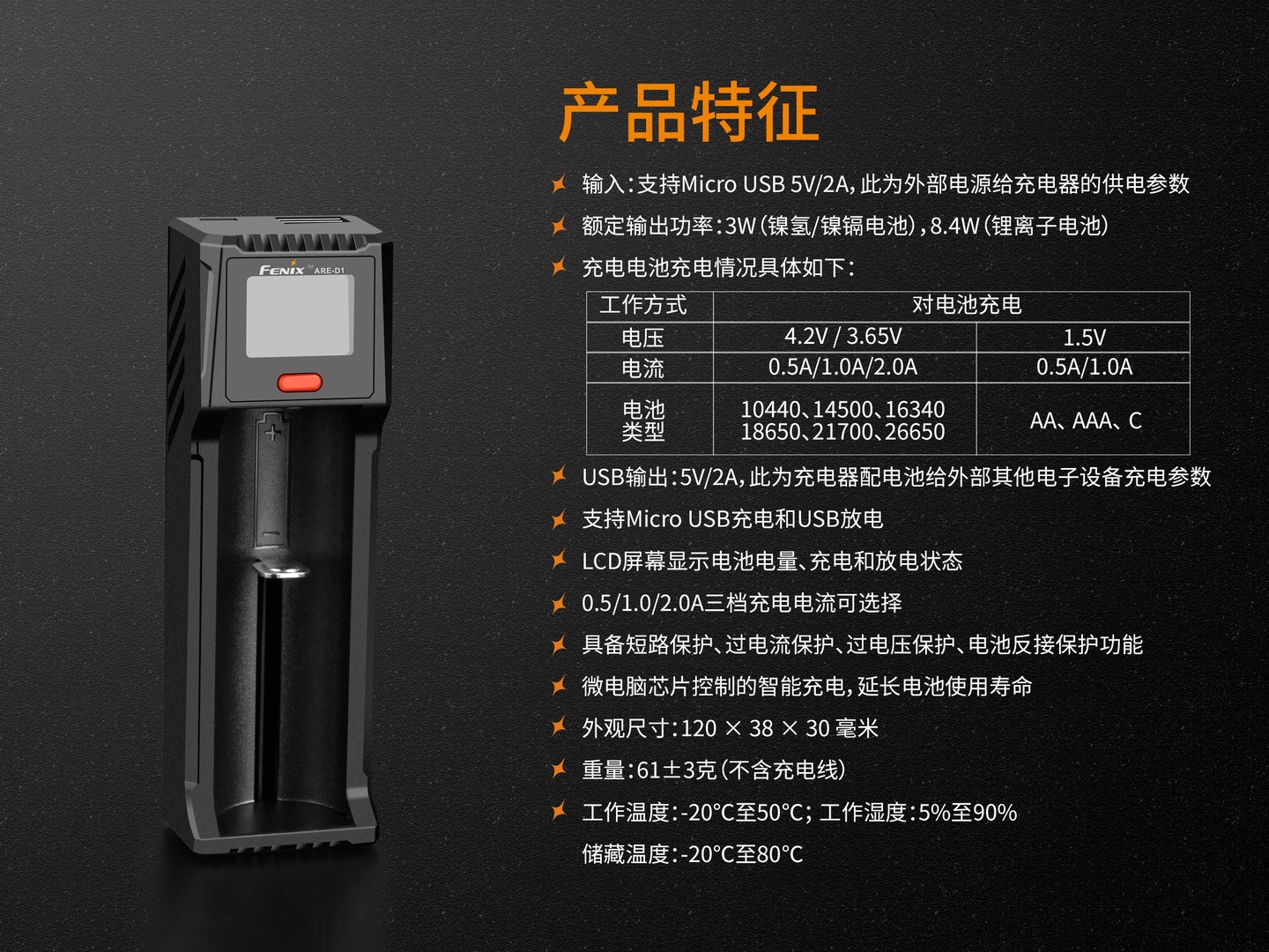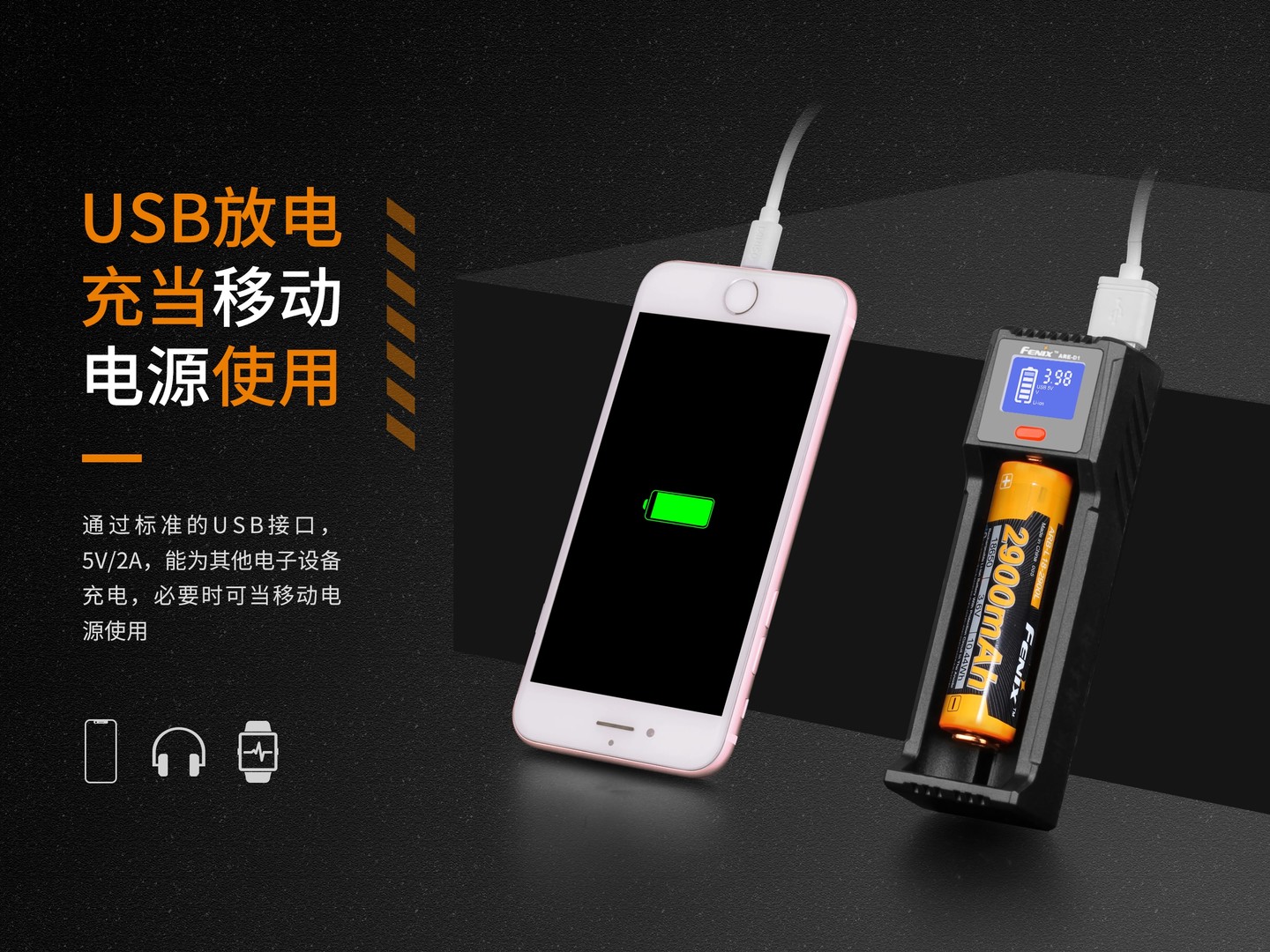 - USB输出:5V/2A,此为充电器配电池给外部其他电子设备充电参数