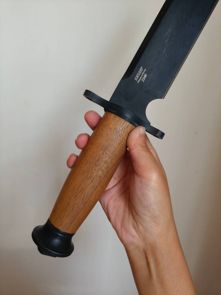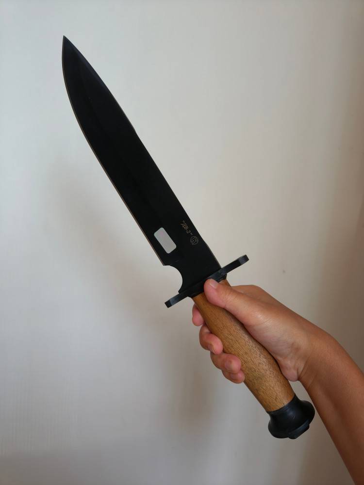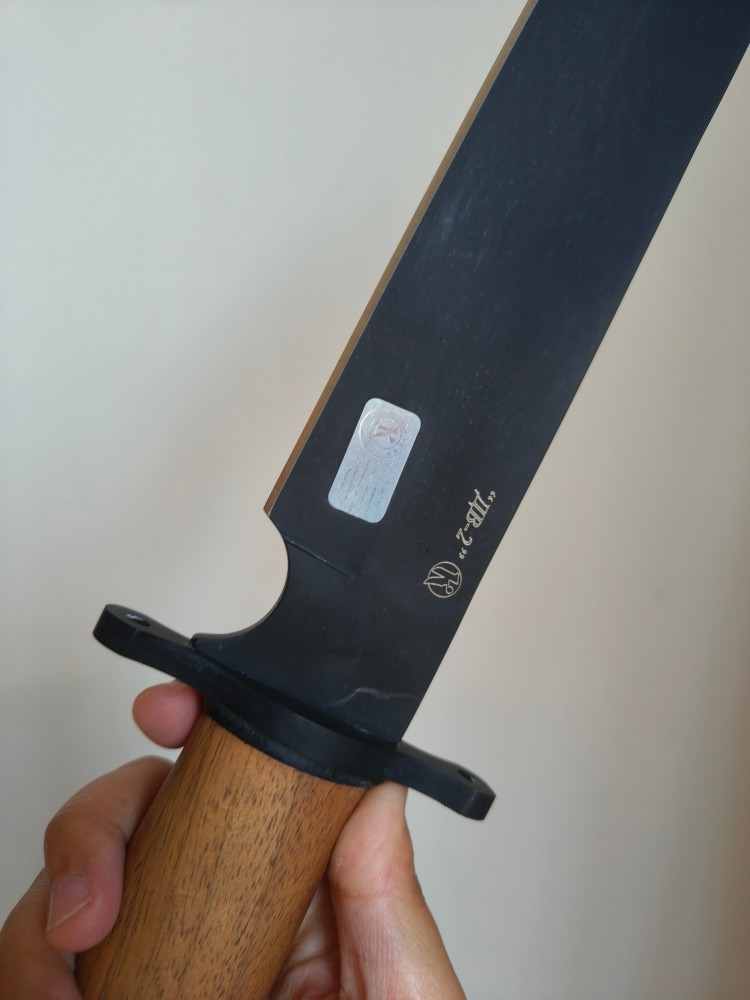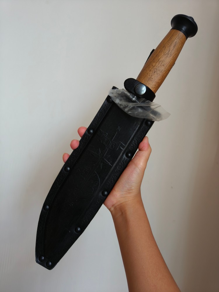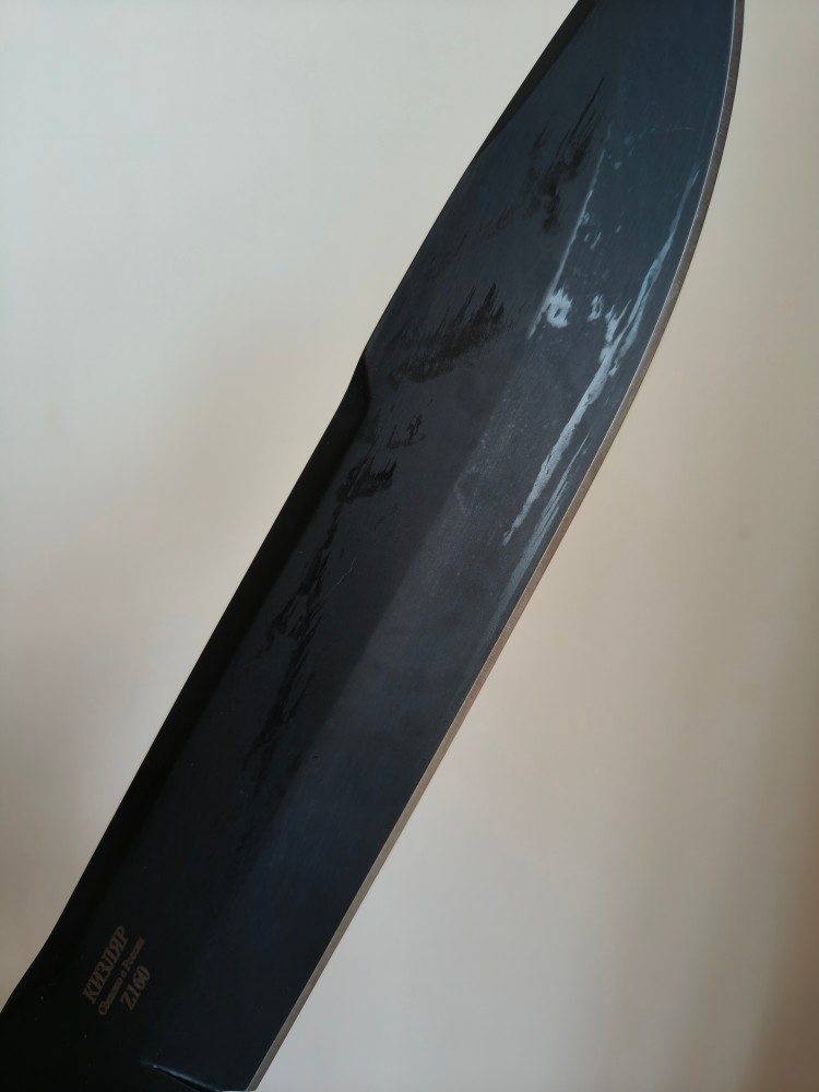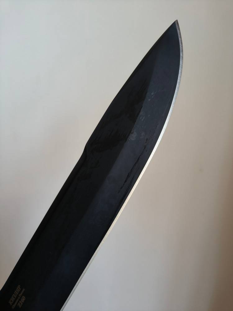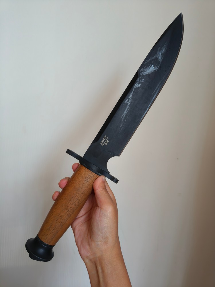 总长度 365 毫米 刀片长度 235 毫米 刀片厚度 5.4 毫米 钢材/材质 碳钢 58-59 HRC 刮刀涂层 黑色镀铬 处理 高加索胡桃木 鞘 真皮
