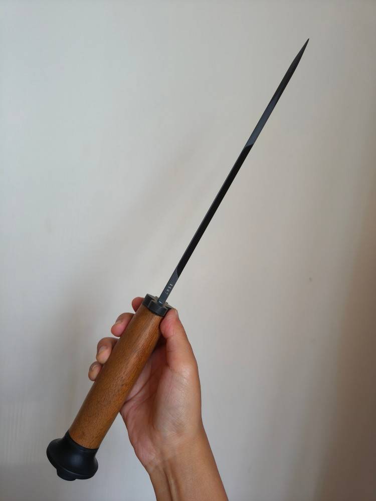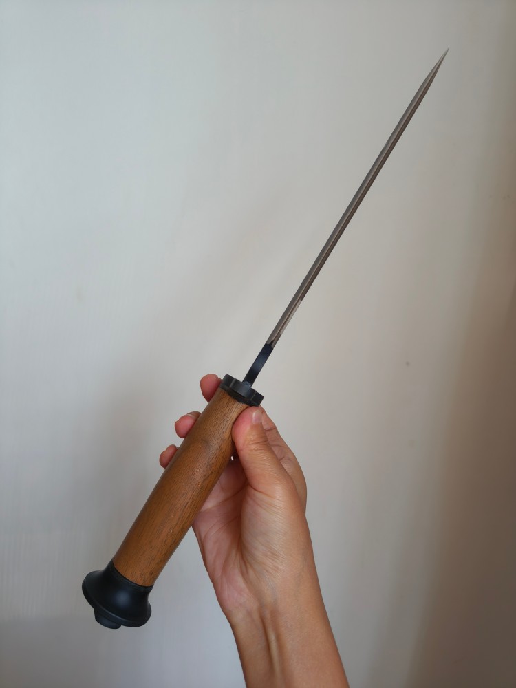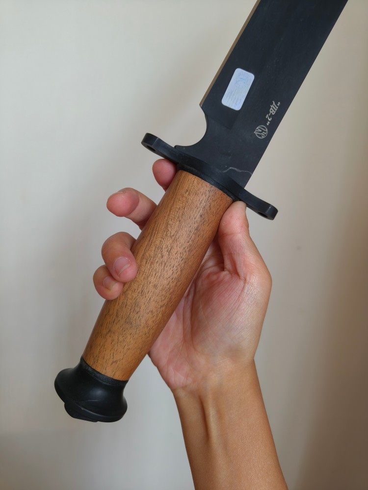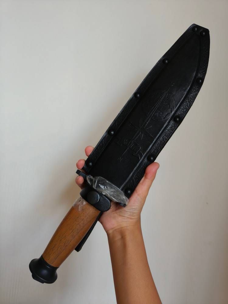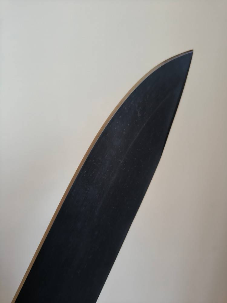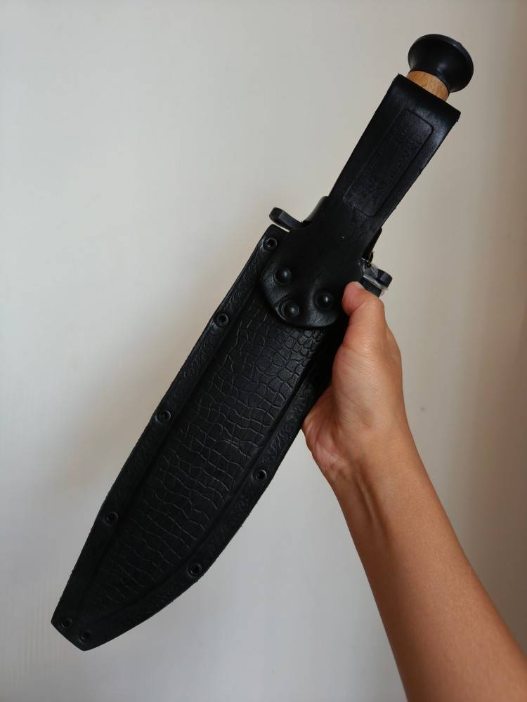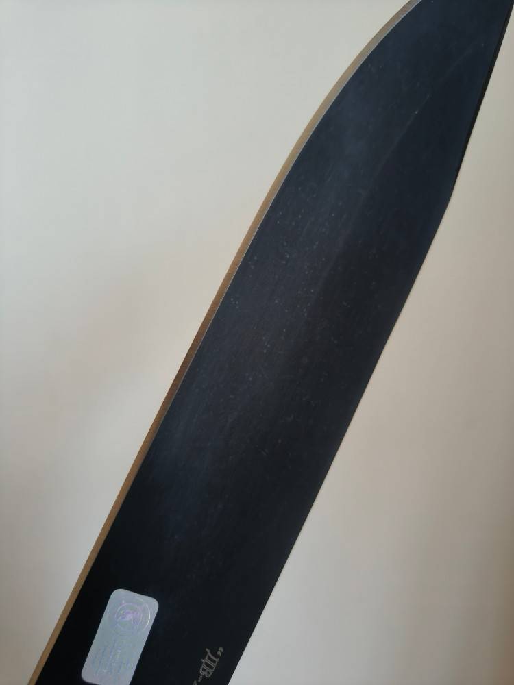 总长度 365 毫米 刀片长度 235 毫米 刀片厚度 5.4 毫米 钢材/材质 碳钢 58-59 HRC 刮刀涂层 黑色镀铬 处理 高加索胡桃木 鞘 真皮