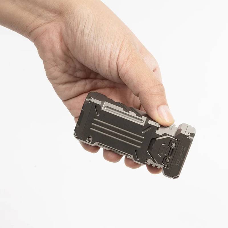 1. **外观设计**:X2采用了方形或者说扁平化的设计,尺寸为85mm*39mm*20mm,重量仅为115g,使得它既小巧又轻便。独特的外观设计让它看起来像是“身披铠甲且面带微笑”的手电。