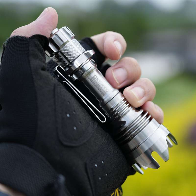 . 独特的双向打击边框- 由钛 TC4 材料制成(自然色原钛或石洗饰面),梯形螺纹设计,可通过旋转边框轻松安装和拆卸。双向意味着 Striker Mini 攻击边框可以安装在两个方向。如果锯齿状边缘攻击头向上,照明方向可用于自卫、夜间战斗和打碎玻璃。如果拆卸并反向安装攻击边框,则外观不那么激进且不显眼。方便携带,可在日常活动中通过安检。7