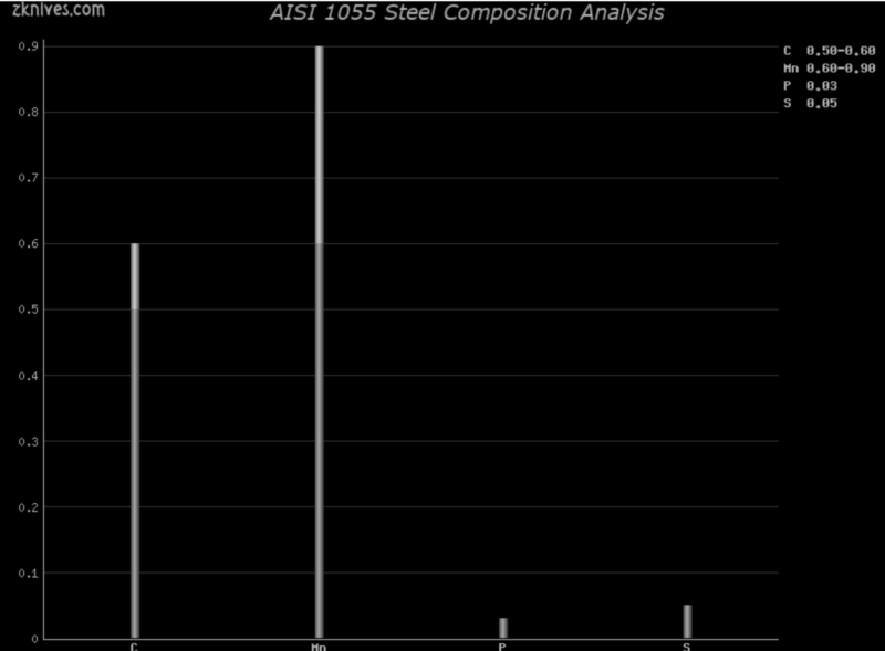 1055(AISI) - 简单碳钢。耐磨性低,抗震性不错。适用于需要冲击强度的大型或投掷刀。