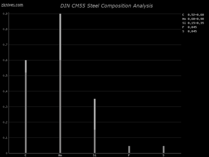 CM55(DIN) - 简单碳钢。耐磨性低,抗震性不错。适用于需要冲击强度的大型或投掷刀。