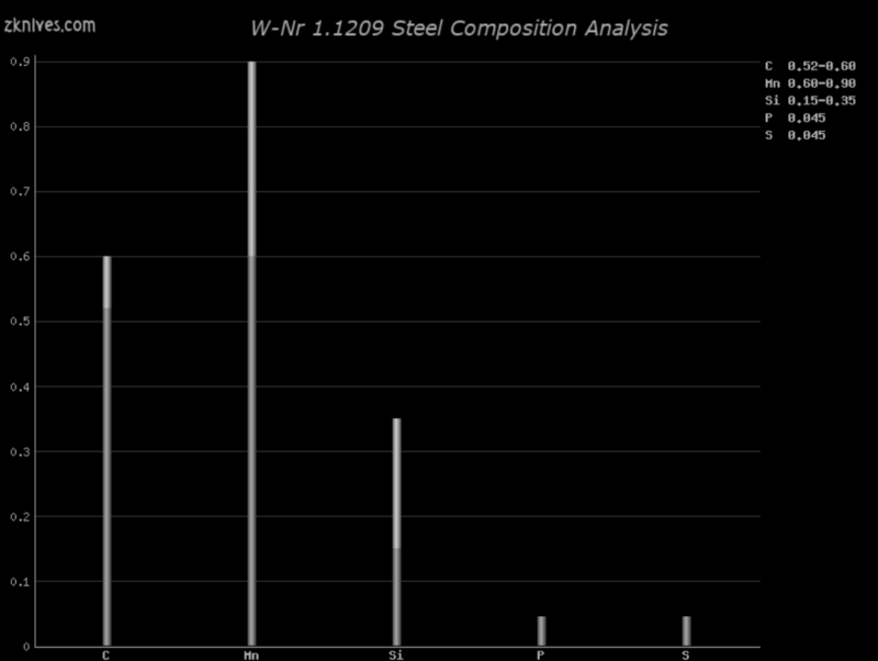 1.1209(W-Nr) - 简单碳钢。耐磨性低,抗震性不错。适用于需要冲击强度的大型或投掷刀。