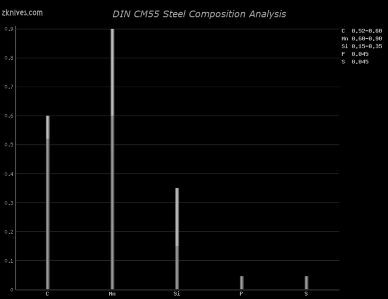CM55(DIN) - 简单碳钢。耐磨性低,抗震性不错。适用于需要冲击强度的大型或投掷刀。