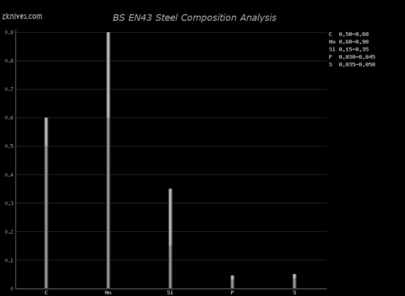 EN43(BS) - 简单碳钢。耐磨性低,抗震性不错。适用于需要冲击强度的大型或投掷刀。