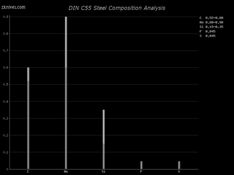 C55(DIN) - 简单碳钢。耐磨性低,抗震性不错。适用于需要冲击强度的大型或投掷刀。