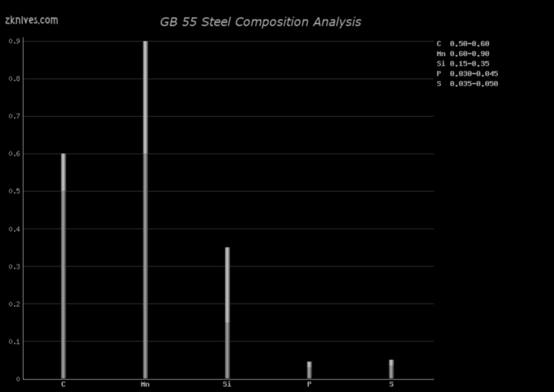 55(GB) - 简单碳钢。耐磨性低,抗震性不错。适用于需要冲击强度的大型或投掷刀。