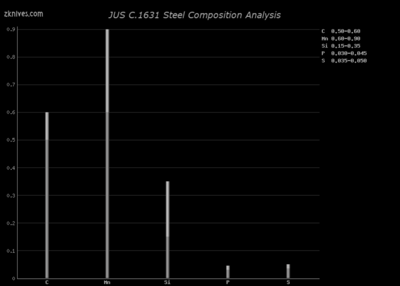 C.1631(JUS) - 简单碳钢。耐磨性低,抗震性不错。适用于需要冲击强度的大型或投掷刀。