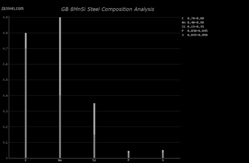 碳(C):0.70%-0.80% 锰(Mn):0.40%-0.90% 硅(Si):0.15%-0.35% 磷(P):0.030%-0.045% 硫(S):0.035%-0.050% 8MnSi(GB) - 相对简单的碳钢。如果热处理得当,可以产生相当不错的效果,一些刀具制造商在他们的廉价刀具中使用它,包括 Boker 文件夹。