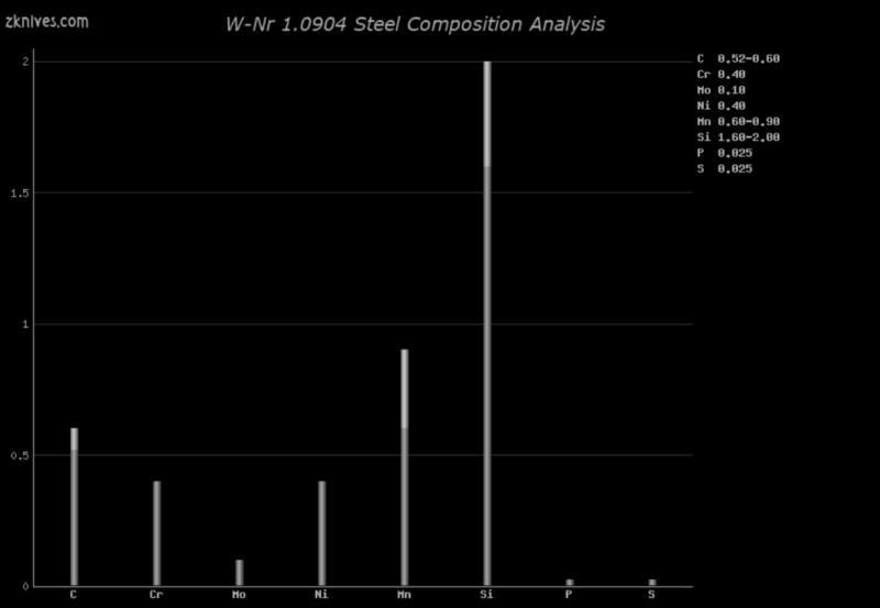1.0904(W-Nr) - 合金结构钢。非常纯净的合金,用于剑,有时也用于刀。刀具的可达到硬度相对较低,仅为 ~56HRC。由于硅含量高,对锻造不是很友好。