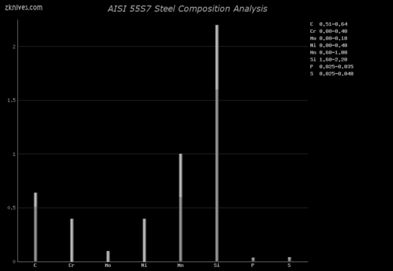 55S7(AISI) - 合金结构钢。非常纯净的合金,使用过剑,有时也用于刀。刀具的可达到硬度相对较低,仅为 ~56HRC。由于硅含量高,对锻造不是很友好。