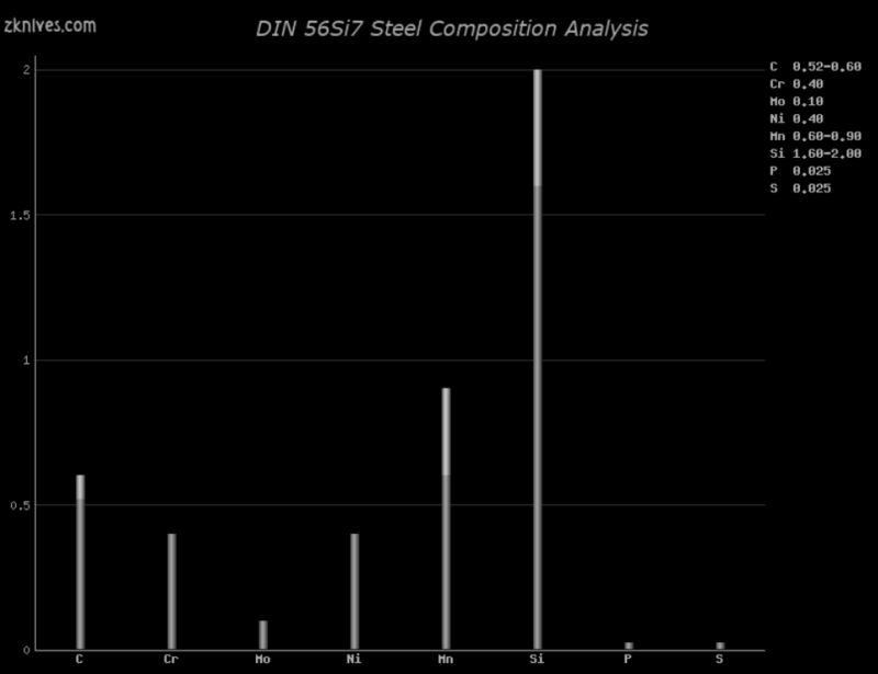56Si7(DIN) - 合金结构钢。非常纯净的合金,用于剑,有时也用于刀。刀具的可达到硬度相对较低,仅为 ~56HRC。由于硅含量高,对锻造不是很友好。