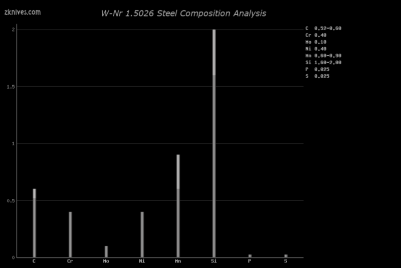 1.5026(W-Nr) - 合金结构钢。非常纯净的合金,用于剑,有时也用于刀。刀具的可达到硬度相对较低,仅为 ~56HRC。由于硅含量高,对锻造不是很友好。