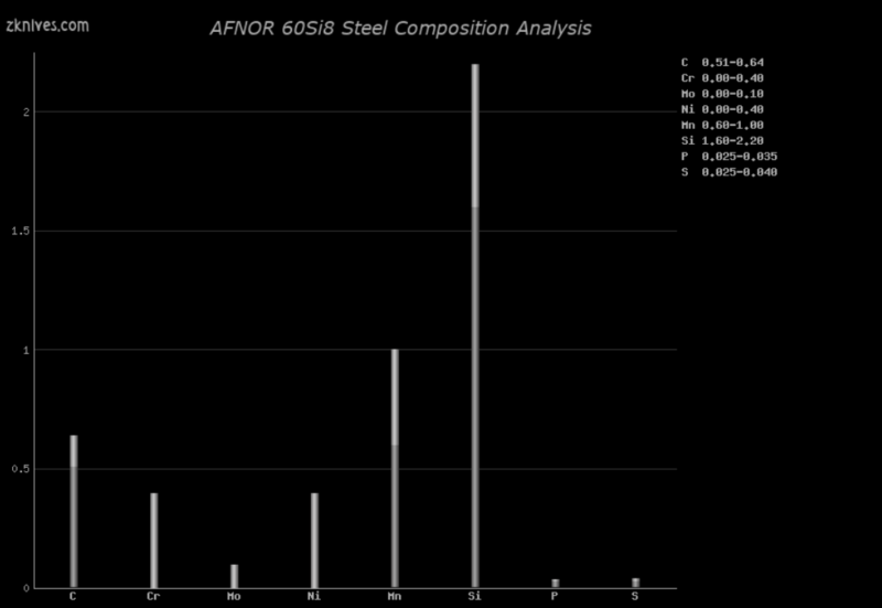 60Si8(AFNOR) - 合金结构钢。非常纯净的合金,使用过剑,有时也用于刀。刀具的可达到硬度相对较低,仅为 ~56HRC。由于硅含量高,对锻造不是很友好。