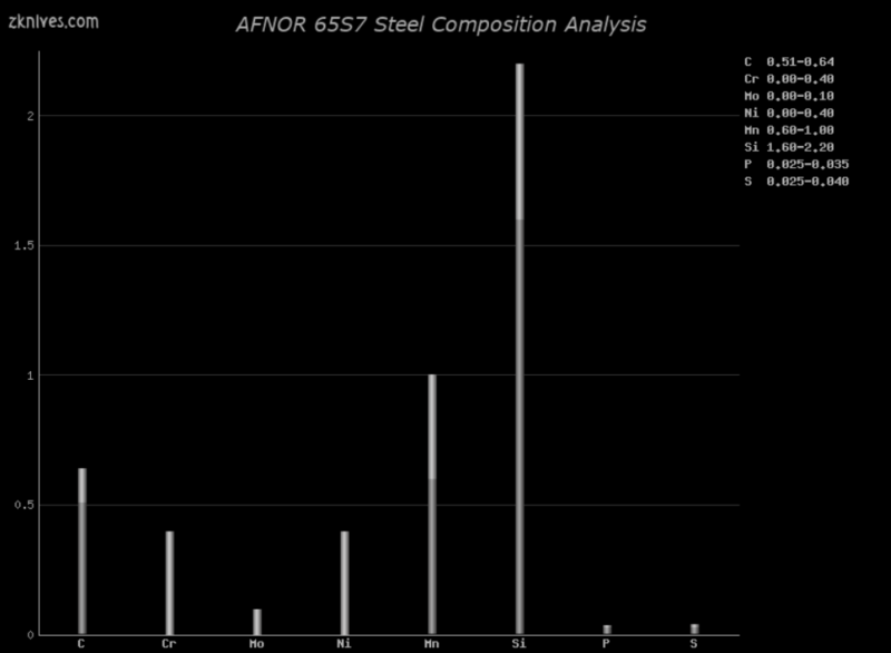 65S7(AFNOR) - 合金结构钢。非常纯净的合金,使用过剑,有时也用于刀。刀具的可达到硬度相对较低,仅为 ~56HRC。由于硅含量高,对锻造不是很友好。
