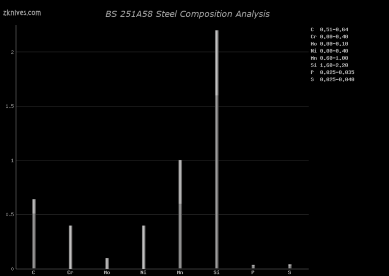 251A58(BS) - 合金结构钢。非常纯净的合金,用于剑,有时也用于刀。刀具的可达到硬度相对较低,仅为 ~56HRC。由于硅含量高,对锻造不是很友好。