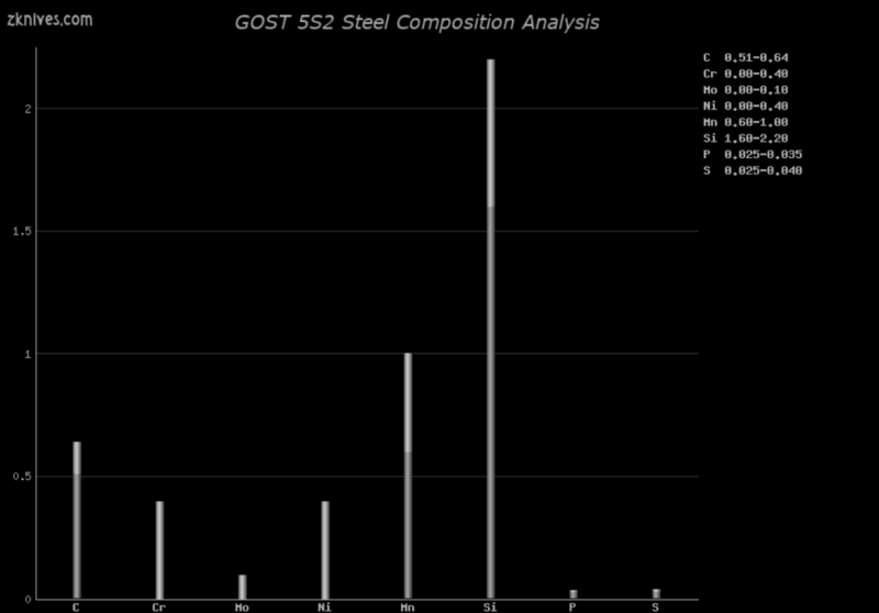 5S2(GOST) - 合金结构钢。非常纯净的合金,用于剑,有时也用于刀。刀具的可达到硬度相对较低,仅为 ~56HRC。由于硅含量高,对锻造不是很友好。
