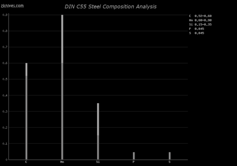 C55(DIN) - 简单碳钢。耐磨性低,抗震性不错。适用于需要冲击强度的大型或投掷刀。