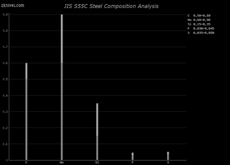 S55C(JIS) - 简单碳钢。耐磨性低,抗震性不错。适用于需要冲击强度的大型或投掷刀。